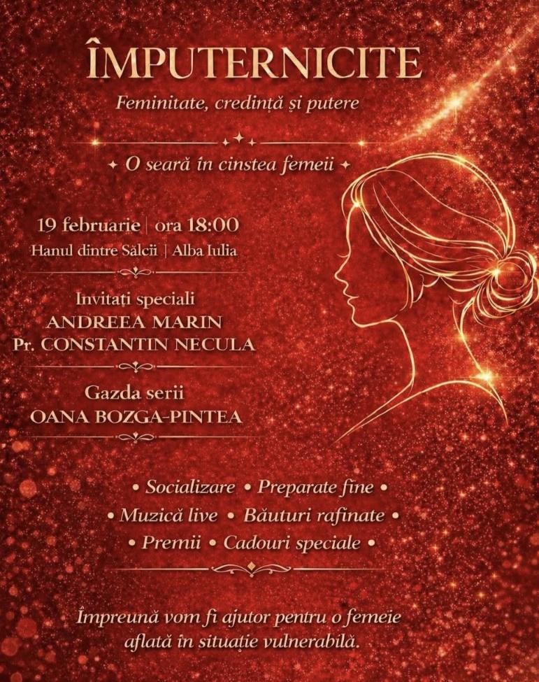 În seara zilei de joi, 19 februarie 2026, de la ora 18.00, la restaurantul „Hanul dintre Sălcii” din Alba Iulia, va avea loc un eveniment caritabil deosebit, derulat în cadrul unei manifestări speciale dedicate femeii. Evenimentul de suflet îi va avea ca invitați speciali pe părintele prof. univ. dr. Constantin Necula, de la Facultatea de Teologie „Sfântul Andei Șaguna” din Sibiu, și pe jurnalista și prezentatoarea de televiziune Andreea Marin. Gazda serii va fi interpreta de muzică populară Oana Bozga-Pintea, care este și organizatoarea acestui eveniment.