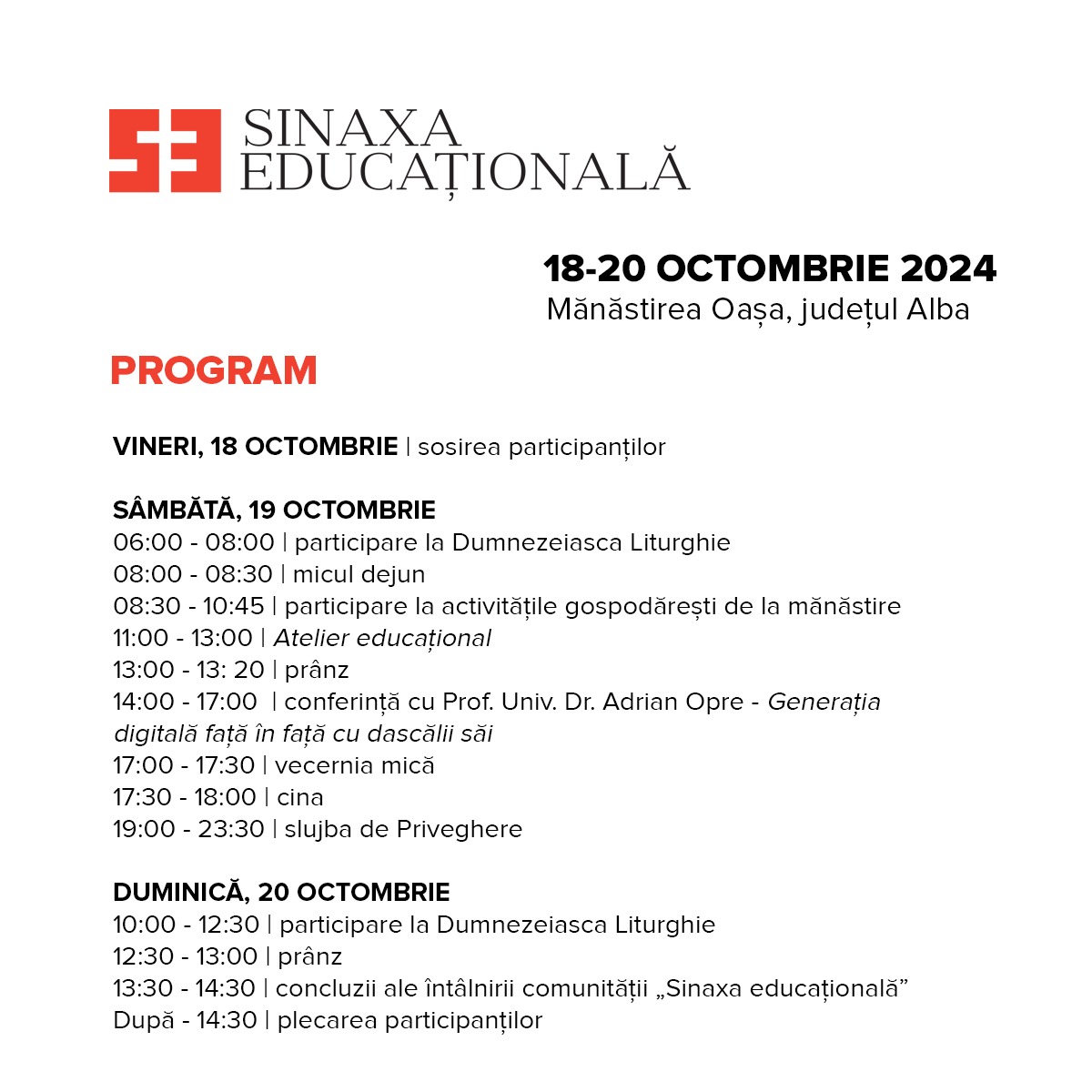 Programul evenimentului va începe vineri, 18 octombrie, când participanții sunt așteptați la mănăstire. Sâmbătă, 19 octombrie, aceștia vor participa la Sfânta Liturghie, vor avea un atelier educațional de la ora 11:00, iar de la ora 14:00 vor avea ocazia să se întâlnească cu prof. univ. dr. Adrian Opre, decanul Facultății de Psihologie și Științele Educației din Cluj, care îi va invita la o reflexie și o dezbatere cu tema „Generația digitală față în față cu dascălii săi”. Întâlnirea Sinaxei educaționale se va încheia duminică, 20 octombrie, după Sfânta Liturghie.