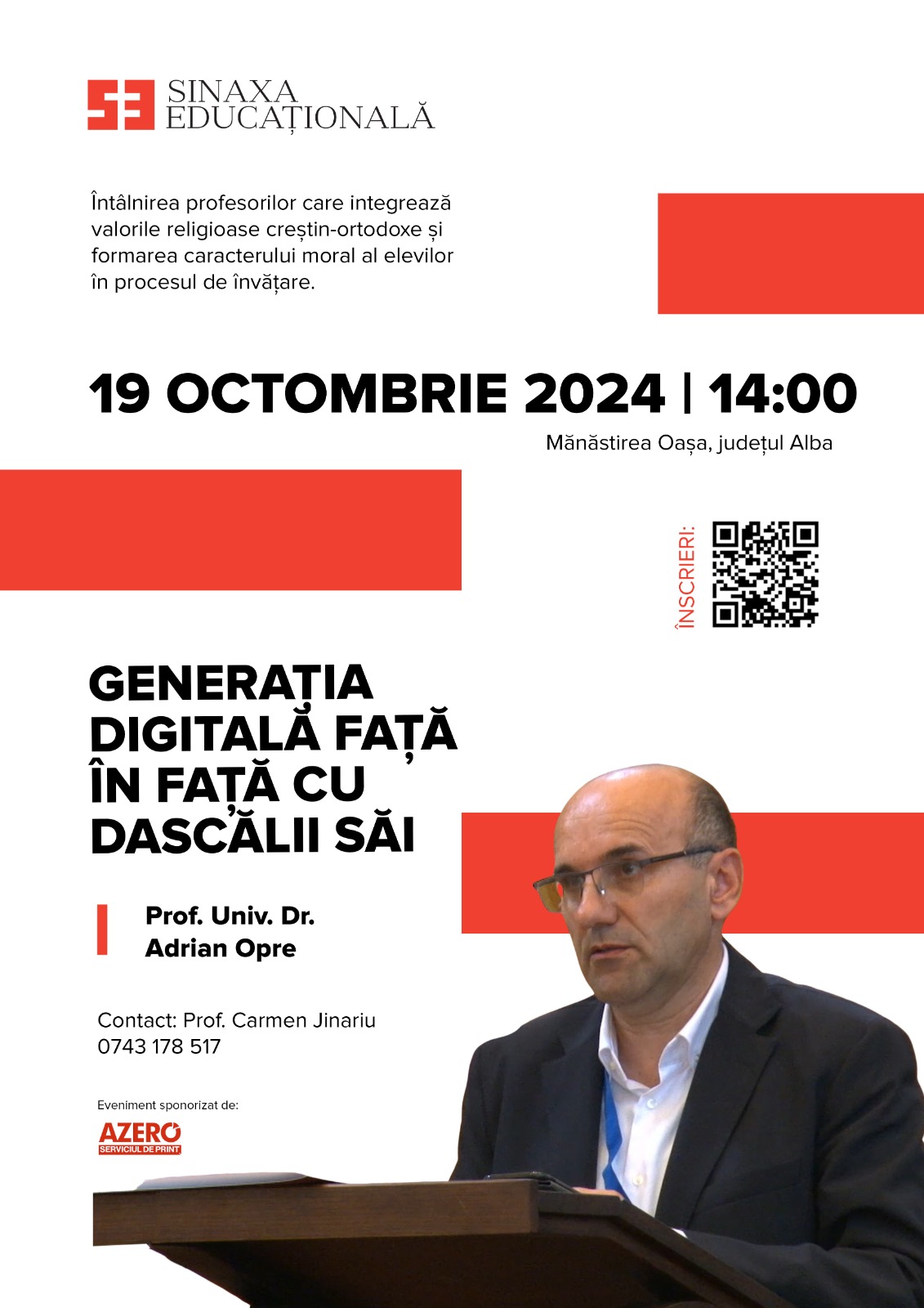 Sinaxa educațională, o comunitate a profesorilor care integrează valorile religioase creștin-ortodoxe și formarea caracterului moral al elevilor în procesul de învățare, vă invită, în perioada 18-20 octombrie 2024, la Mănăstirea Oașa, județul Alba, la întâlnirea de toamnă cu tema „Generația digitală față în față cu dascălii săi”.
