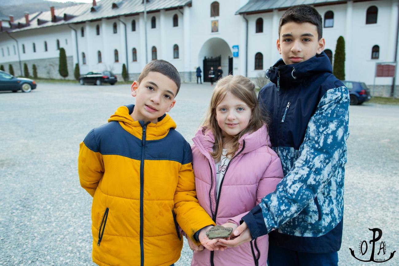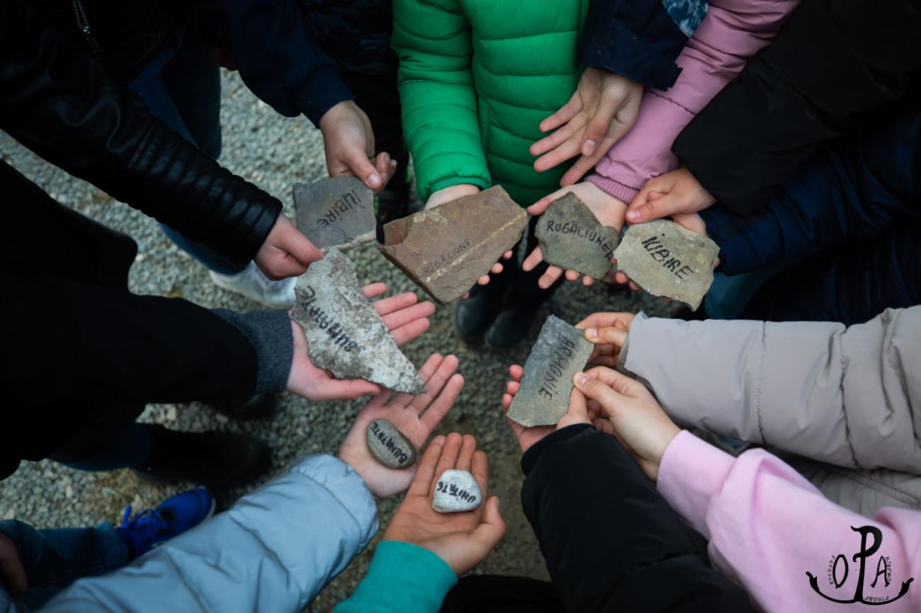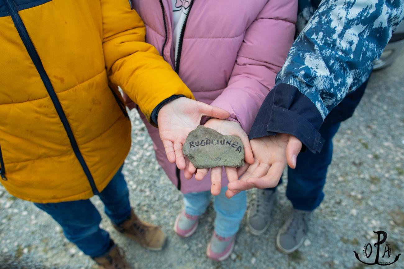 În ultima secțiune, copiii au pregătit ,,piatra de temelie” a familiei lor, o piatră culeasă din albia râului Geoagiu, pe care tinerii au înscris virtutea creștină cu care se identifică sau ar vrea să se identifice familiile lor. În încheiere, grupul s-a închinat la racla sfintelor moaște ale Sfântului Dometie, cerând binecuvântare și purtare de grijă pentru familiile noastre, să învățăm, să creștem, să slăvim pe Dumnezeu și să ne bucurăm unii de alții în acest ,,cocon” al sfințeniei – familia.