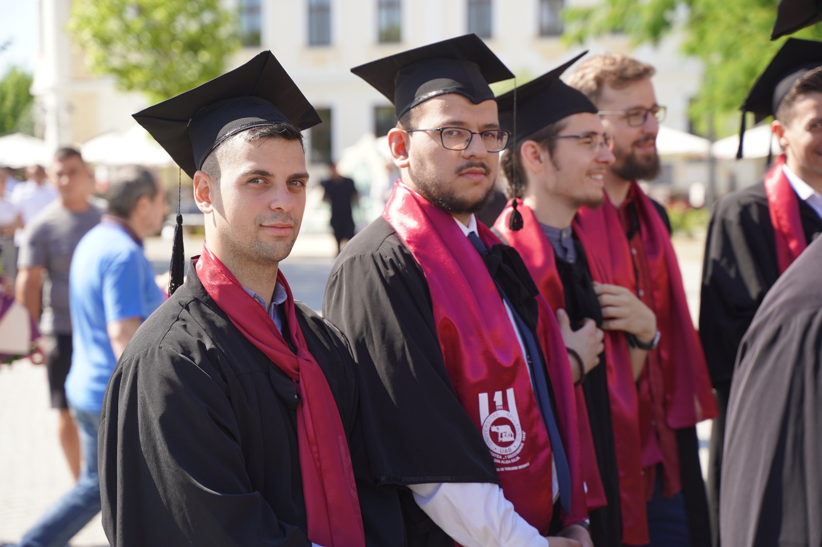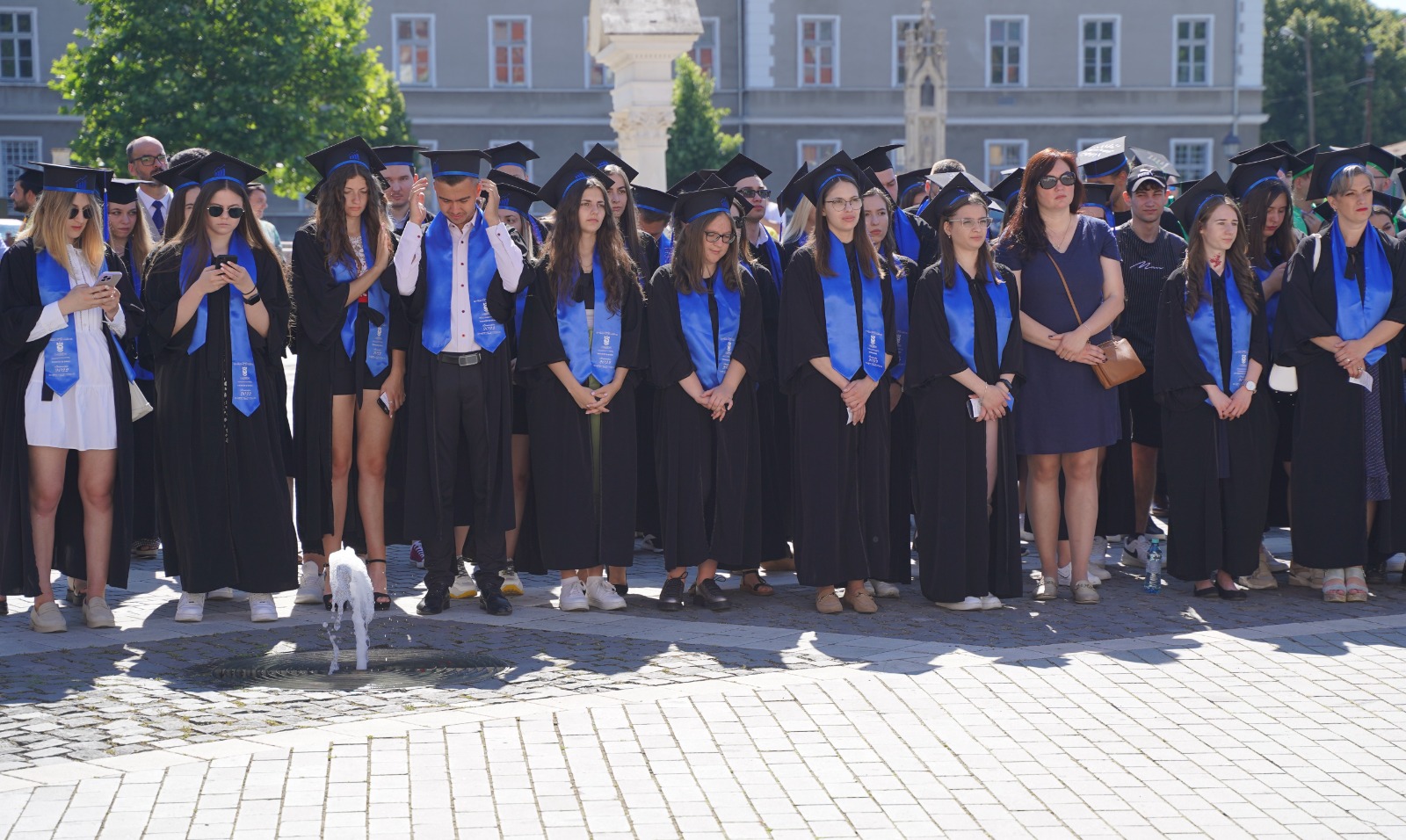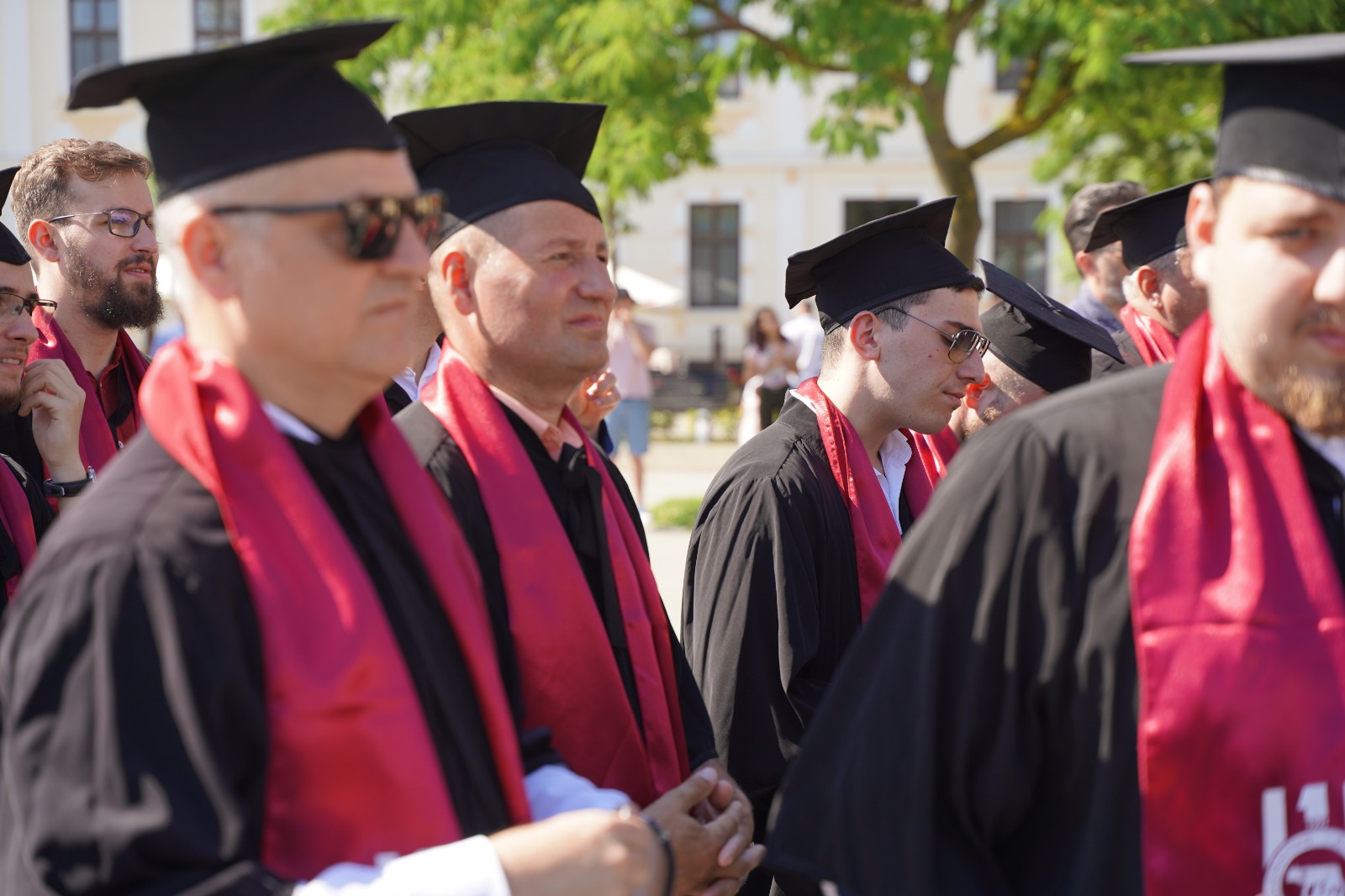 Ajunși pe esplanada din fața Sălii Unirii (Piața Cetății), studenții și invitații acestora au luat parte la festivitatea de absolvire, derulată în prezența Senatului Universității „1 Decembrie 1918” in Alba Iulia, a corpului profesoral și a oficialităților județene și locale. De asemenea, evenimentul a inclus momentul simbolic de predare a Cheii Promoției, acordarea diplomelor pentru studenții merituoși și depunerea jurământului. În cadrul ceremoniei, Întâistătătorul Eparhiei noastre le-a adresat studenților un părintesc cuvânt de învățătură, felicitându-i cu ocazia absolvirii cursurilor universității din Alba Iulia.