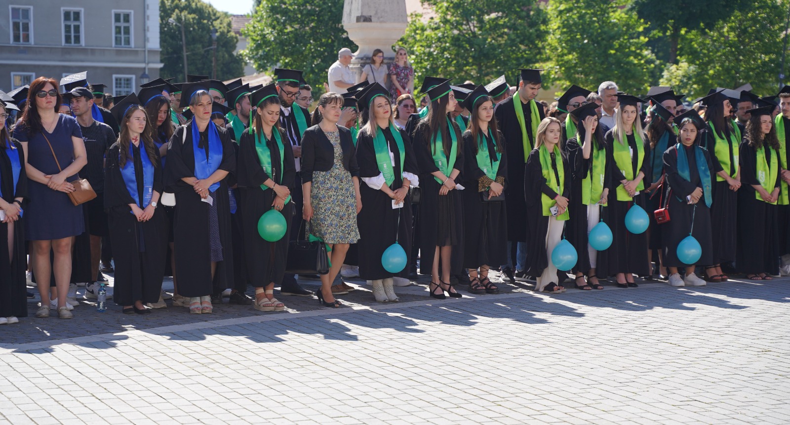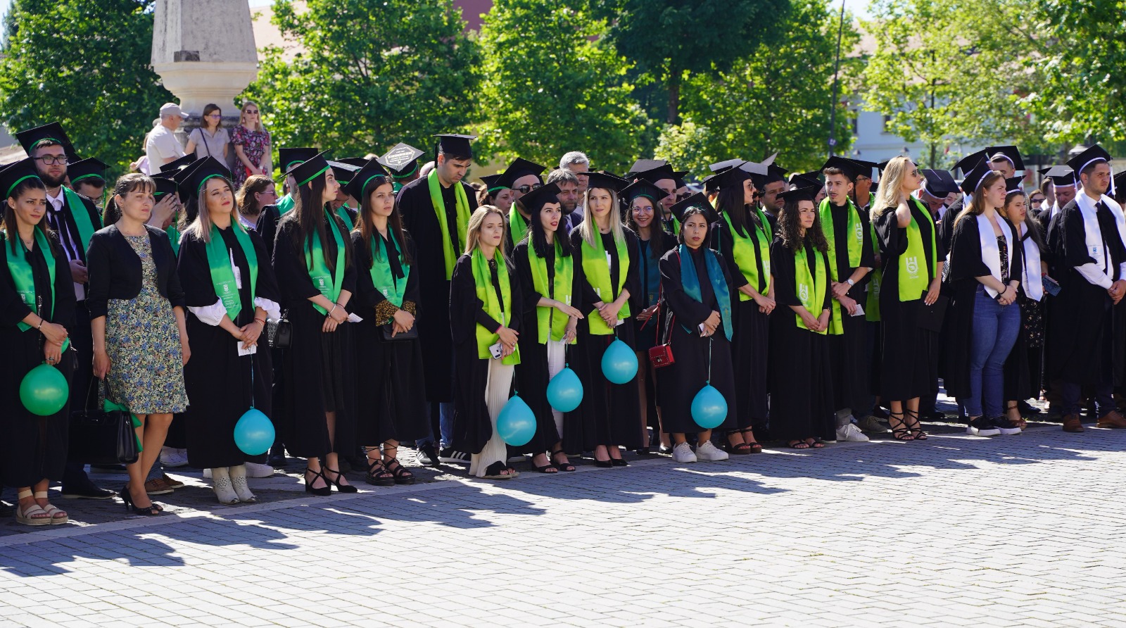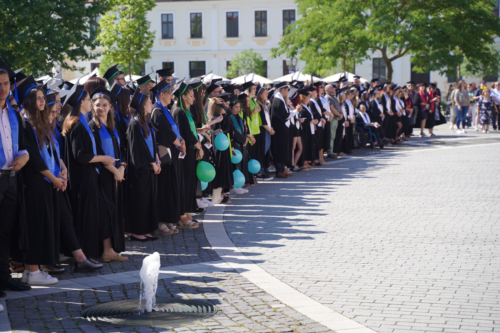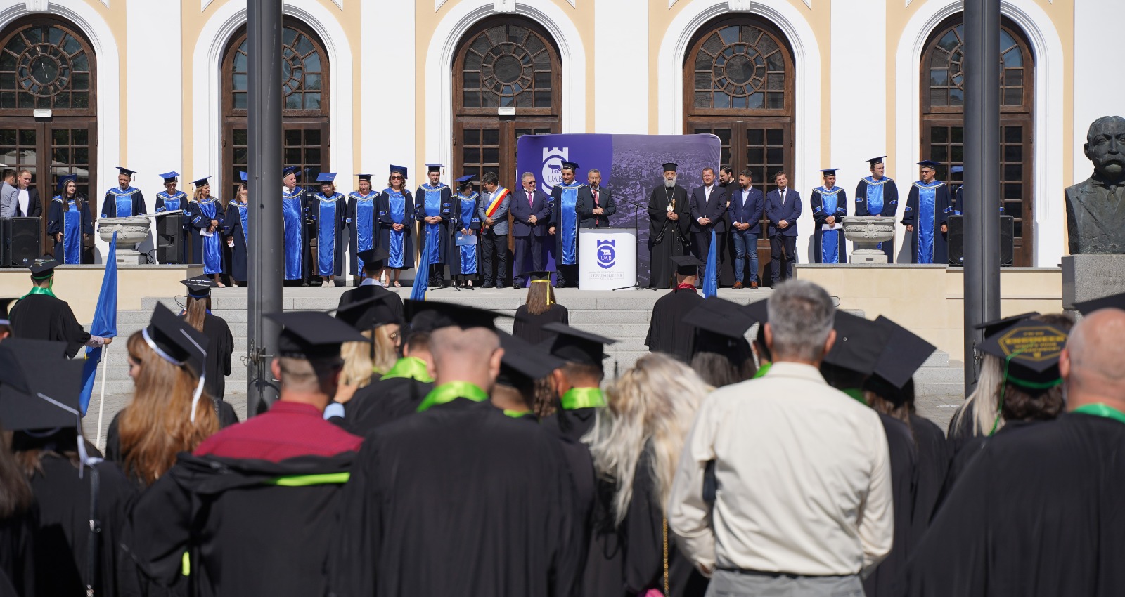 Ajunși pe esplanada din fața Sălii Unirii (Piața Cetății), studenții și invitații acestora au luat parte la festivitatea de absolvire, derulată în prezența Senatului Universității „1 Decembrie 1918” in Alba Iulia, a corpului profesoral și a oficialităților județene și locale. De asemenea, evenimentul a inclus momentul simbolic de predare a Cheii Promoției, acordarea diplomelor pentru studenții merituoși și depunerea jurământului. În cadrul ceremoniei, Întâistătătorul Eparhiei noastre le-a adresat studenților un părintesc cuvânt de învățătură, felicitându-i cu ocazia absolvirii cursurilor universității din Alba Iulia.