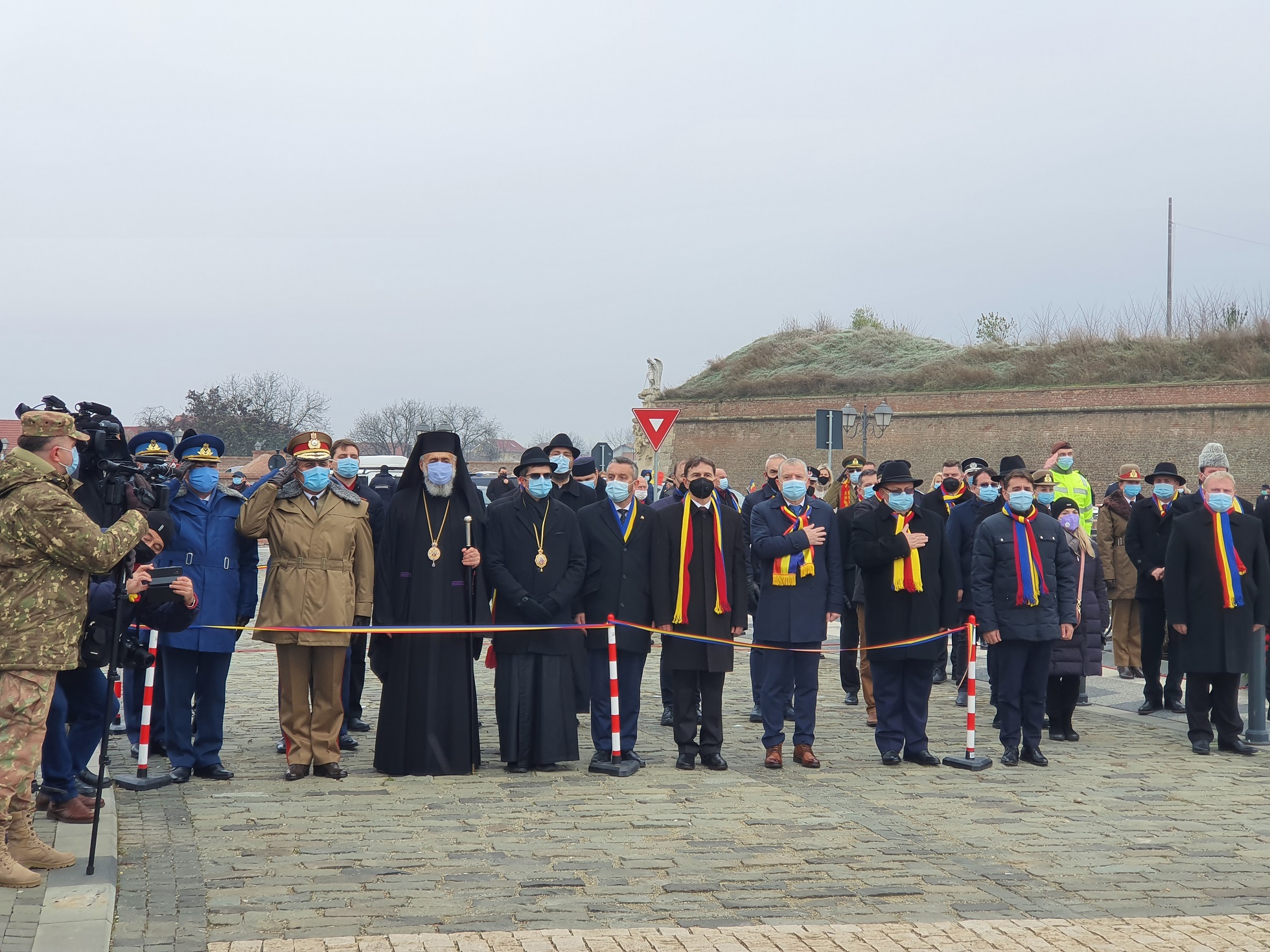 În continuare, de la ora 14.00, Părintele Arhiepiscop Irineu a luat parte la ceremonia militară organizată la Monumentul Unirii, desfășurată cu participarea unui detașament de onoare, cu efective reduse, fără tehnică, din structurile Diviziei 4 Infanterie „Gemina”. În cadrul ceremoniei a fost intonat Imnul Național al României, după care a fost depusă o coroană de flori în memoria făuritorilor Marii Uniri de la 1 Decembrie 1918.