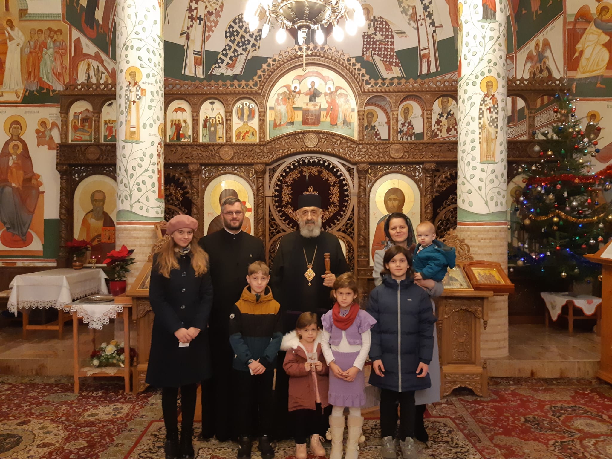 Mai departe, Înaltpreasfințitul Părinte Irineu a fost prezent la biserica „Adormirea Maicii Domnului”, locaș de cult la Altarul căruia slujesc părintele Bogdan Șalariu, preot al parohiei Cugir V, și părintele Adrian Cebotari, păstor al parohiei Cugir VII. Întâistătătorul Eparhiei noastre a fost întâmpinat cu multă căldură sufletească către credincioșii celor două parohii, care au interpretat colinde tradiționale specifice zonei. Totodată, Chiriarhul nostru le-a adresat celor prezenți cuvinte și sfaturi duhovnicești.