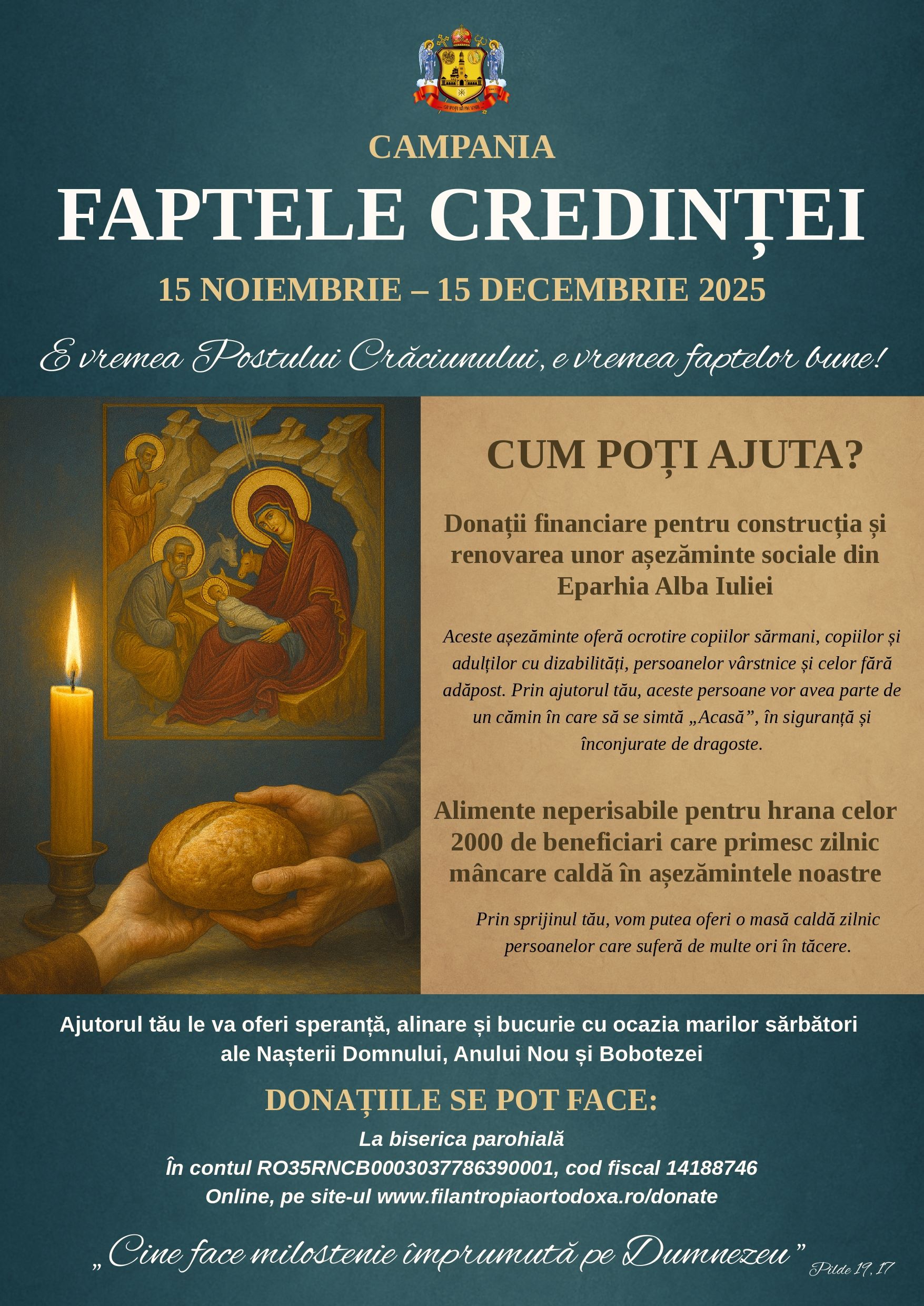 În perioada 15 noiembrie – 15 decembrie 2025, cu binecuvântarea Înaltpreasfințitului Părinte Irineu, Arhiepiscopia Ortodoxă Română a Alba Iuliei organizează și în acest an Campania „Faptele Credinței”. În toate parohiile din Eparhie, preoții și credincioșii sunt chemați să sprijine, prin donații, copiii, vârstnicii și persoanele cu dizabilități care se confruntă cu dificultăți sociale, mai ales în apropierea sărbătorilor de iarnă.