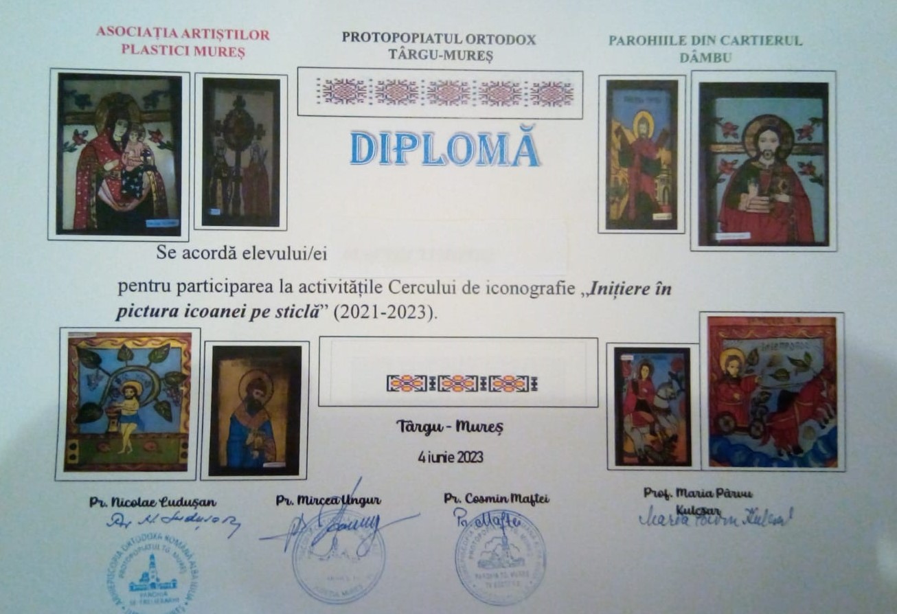 Duminică, 4 iunie 2023, cu ocazia Praznicului Pogorârii Sfântului Duh, la biserica „Sfinții Trei Ierarhi” din cartierul târgumureșean Dâmbu Pietros a avut loc încheierea festivă a proiectului „Inițiere în pictura icoanei pe sticlă”. Proiectul, derulat în perioada 2021-2023, a fost coordonat de către prof. Maria Pârvu Kulcsar, membră a Asociației Artiștilor Plastici Mureș.