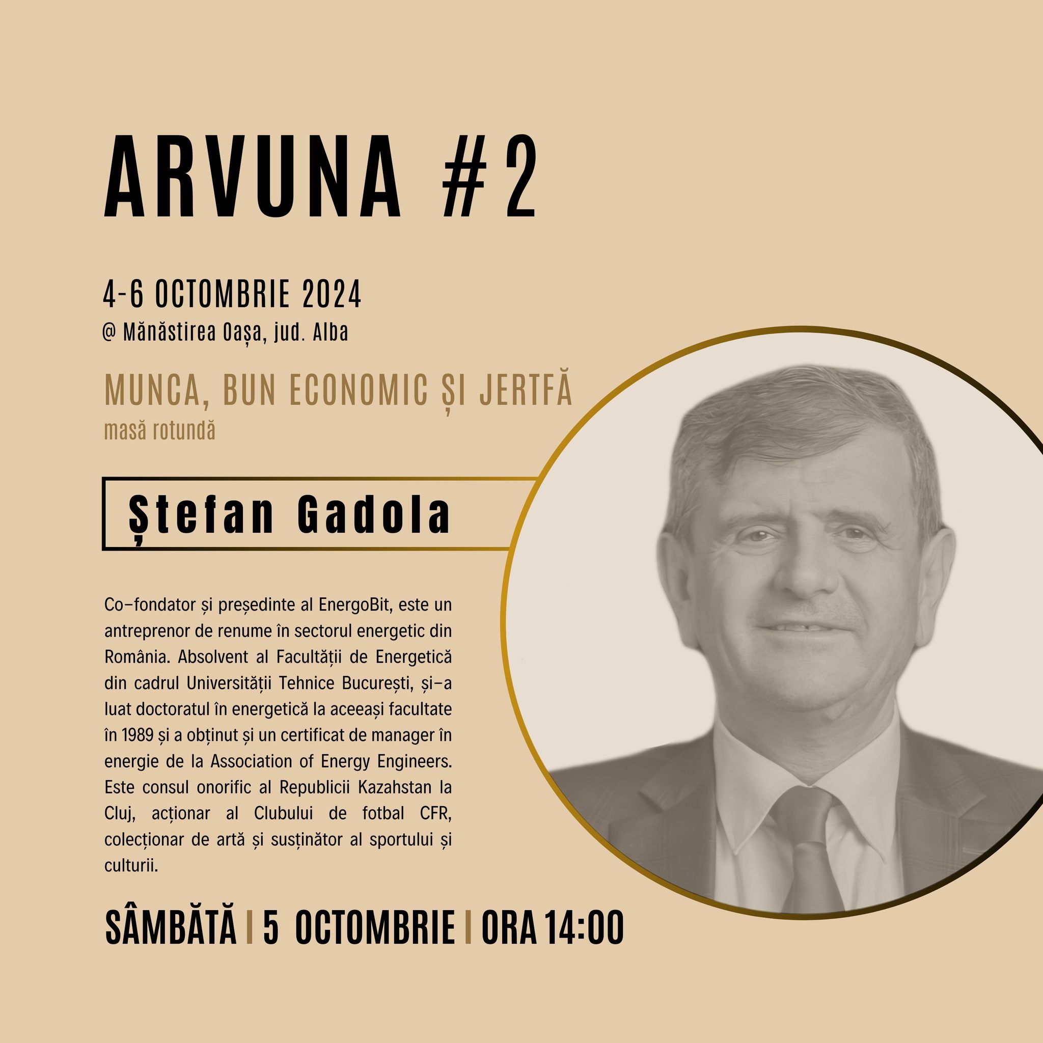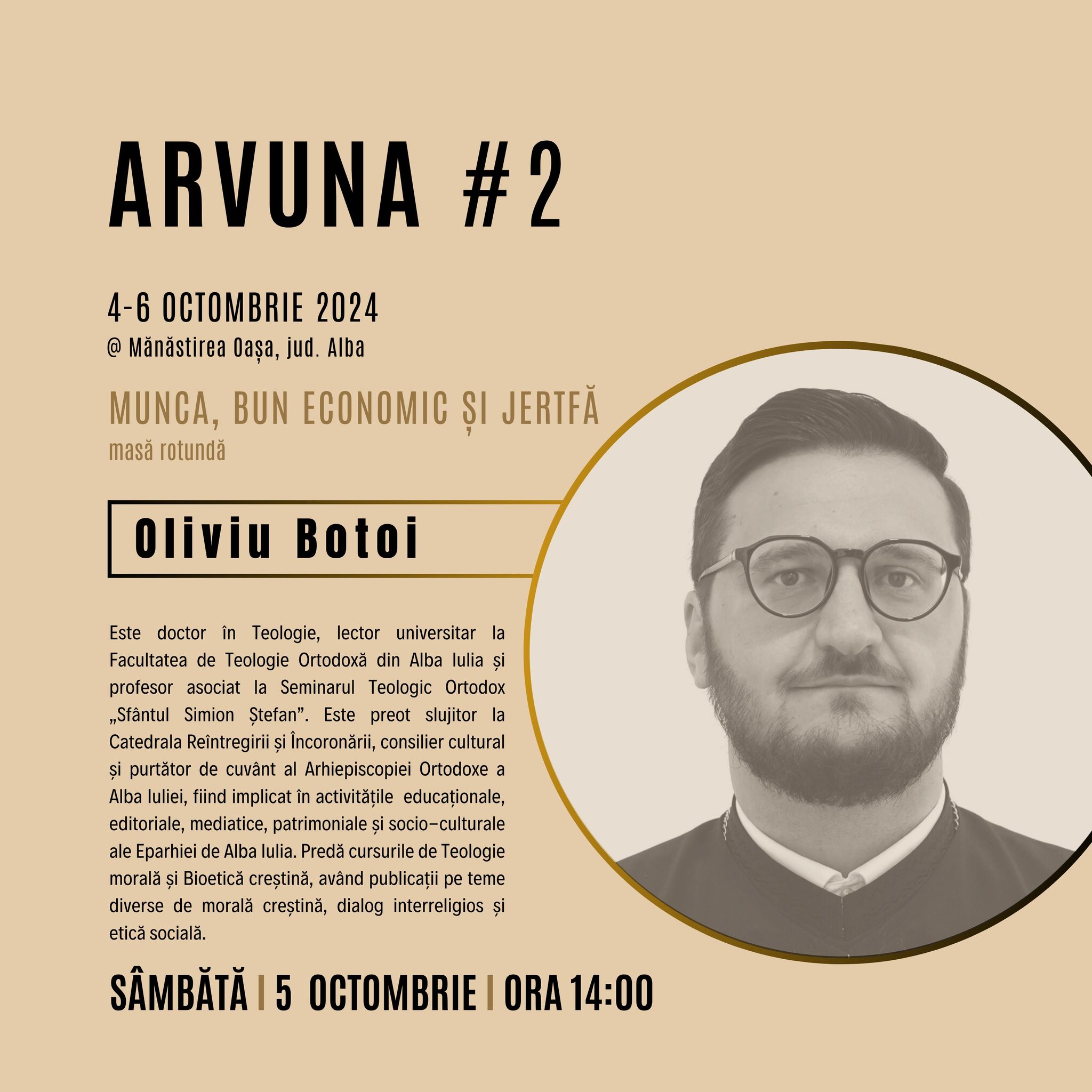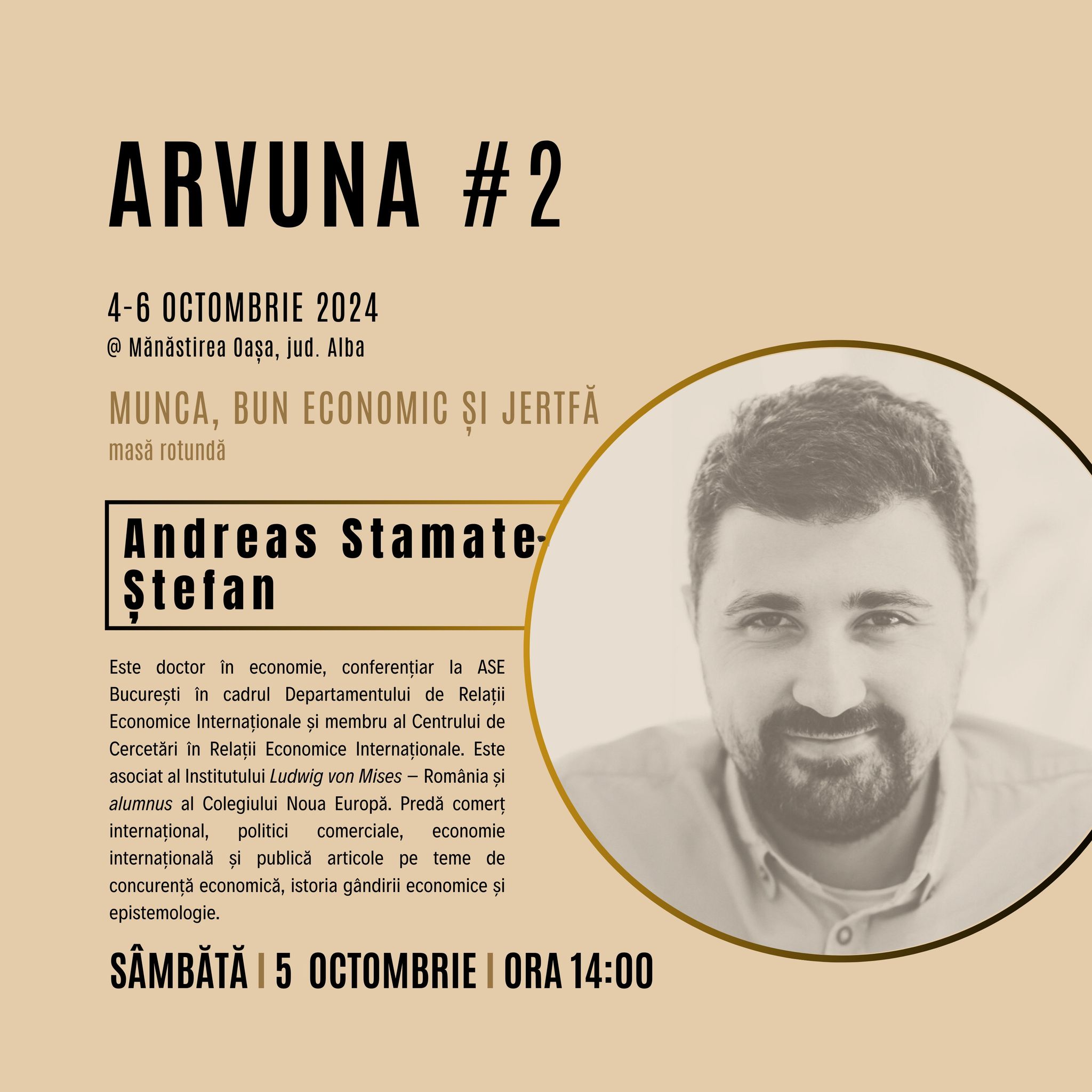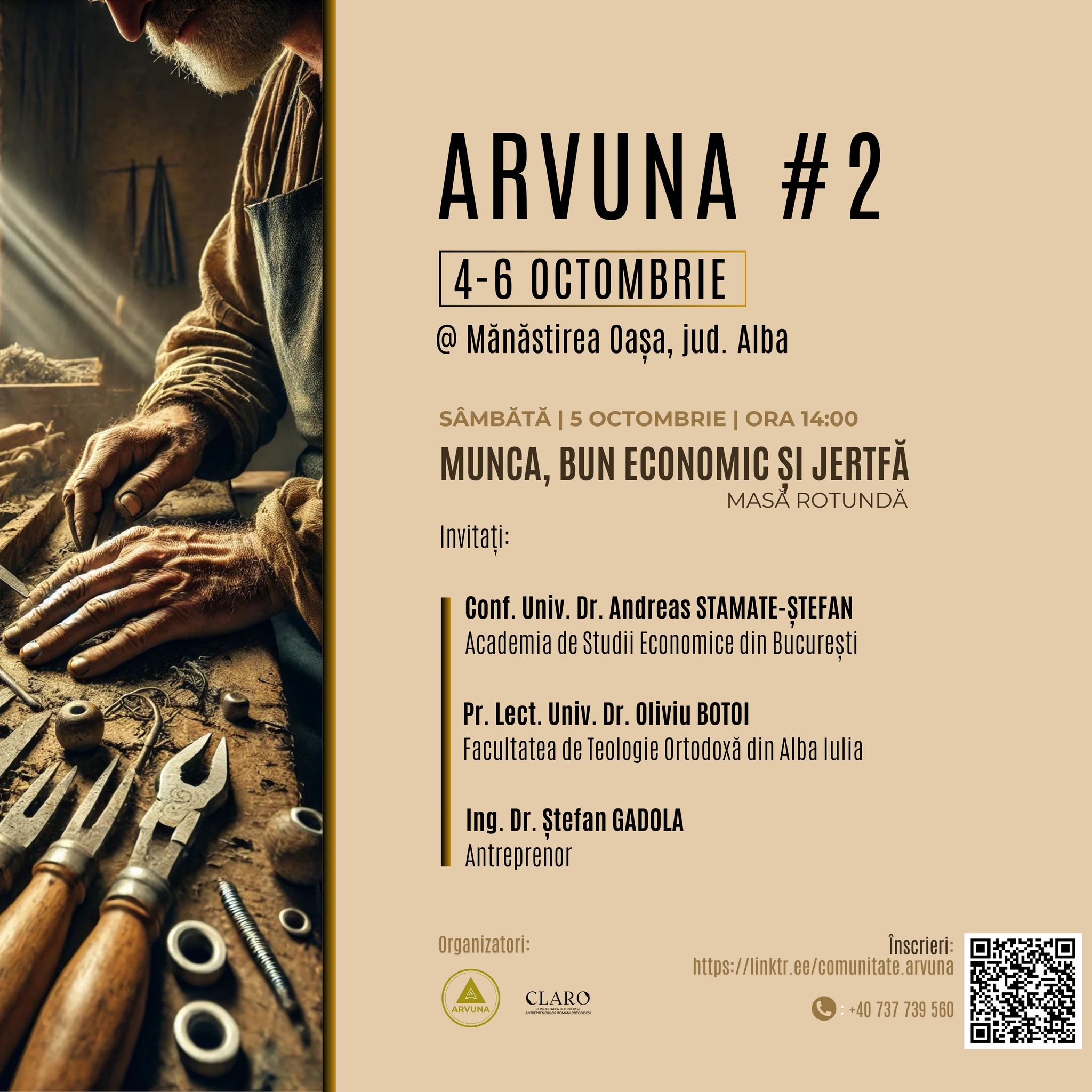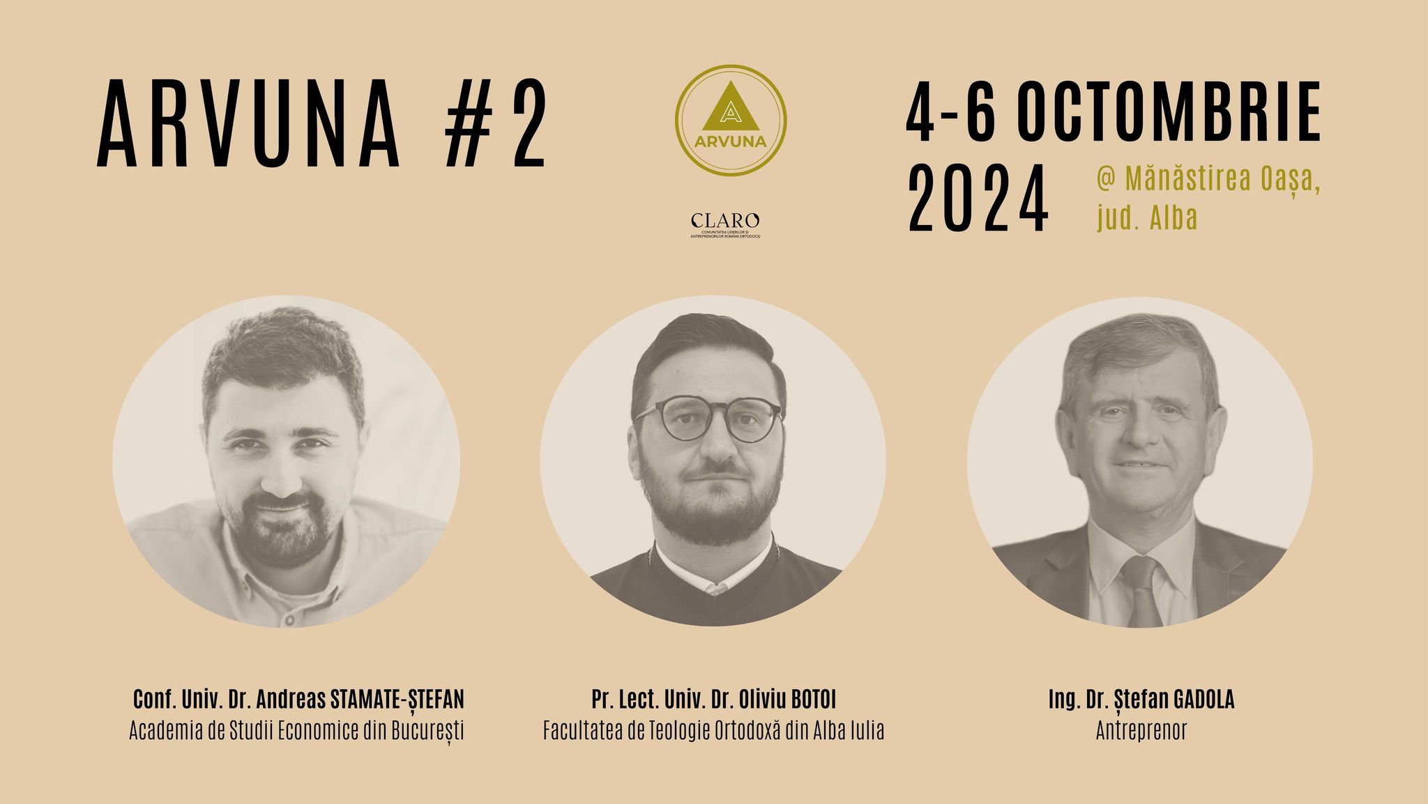 Conf. univ. dr. Andreas Stamate Ștefan (economist), de la Academia de Studii Economice București, pr. lect. univ. dr. Oliviu Botoi (cleric ortodox), de la Facultatea de Teologie Ortodoxă din Alba Iulia, și ing. dr. Ștefan Gadola (antreprenor) vor participa la o masă rotundă intitulată „Munca, bun economic și jertfă”, în cadrul întâlnirii de toamnă a comunității „Arvuna”, care se va desfășura în peioada 4-6 octombrie 2024, la Mănăstirea Oașa, județul Alba.