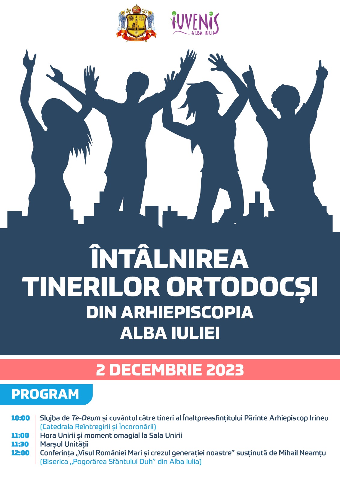 În ziua de 2 decembrie 2023, la Alba Iulia va avea loc Întâlnirea tinerilor ortodocși din Arhiepiscopia Alba Iuliei, eveniment organizat în contextul manifestărilor dedicate Zilei Naționale a României, când se împlinesc 105 ani de la Marea Unire. La această întrunire de tineret vor lua parte peste 500 de tineri din cele 10 protopopiate ale județelor Mureș și Alba. Programul manifestării va fi următorul: