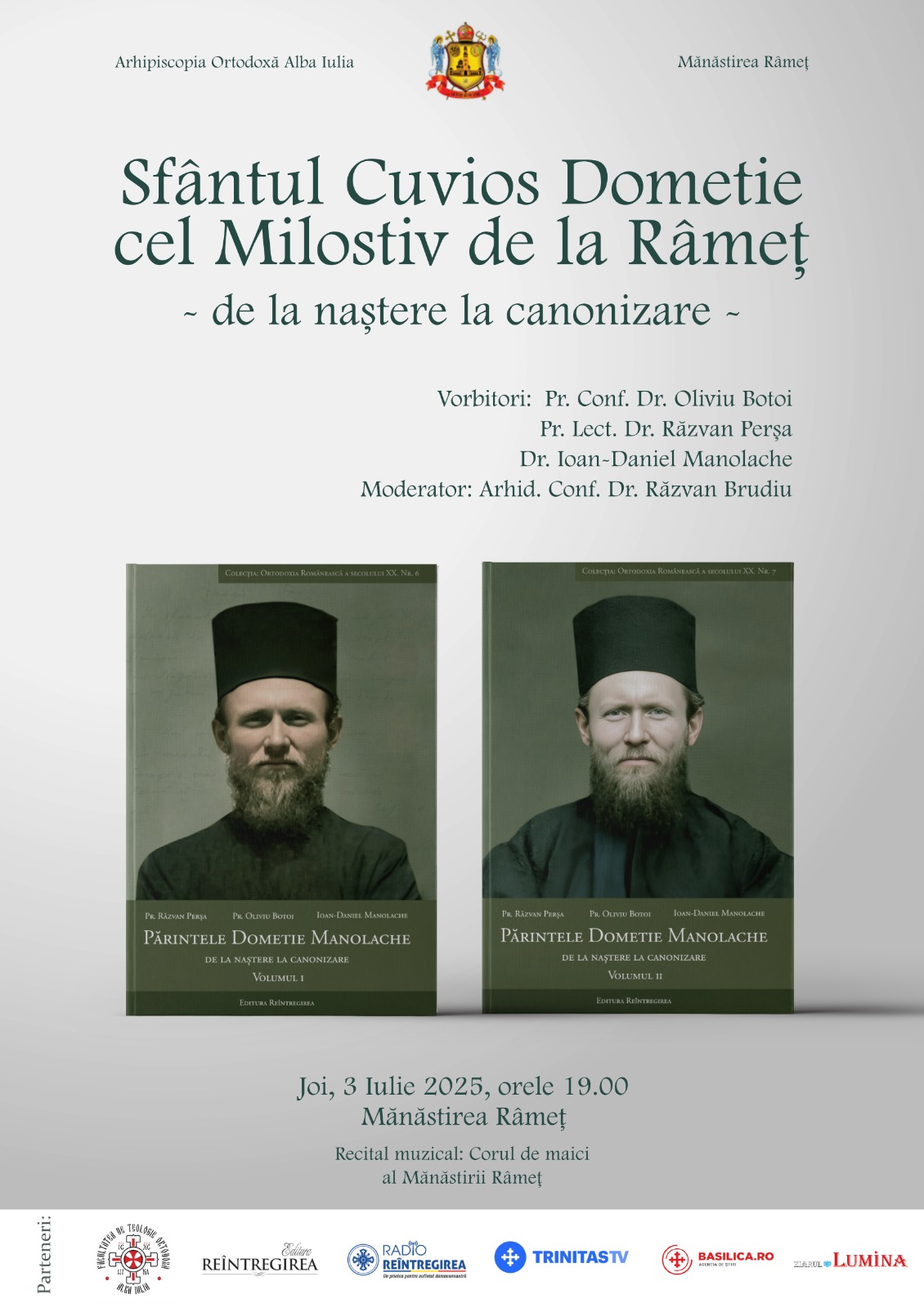 Joi, 3 iulie a.c., Mănăstirea „Sfinții Apostoli Petru și Pavel” de la Râmeț va fi gazda unui eveniment cultural-duhovnicesc deosebit. În contextul manifestărilor organizate cu prilejul proclamării locale a canonizării Sfântului Cuvios Dometie cel Milostiv de la Râmeț, va avea loc lansarea noilor apariții editoriale despre viața și activitatea celui care a fost duhovnic și povățuitor al obștii Mănăstirii Râmeț în perioada 1959-1975. Este vorba despre lucrarea „Părintele Dometie Manolache – de la naștere la canonizare”, vol. I-II (Alba Iulia, Editura Reîntregirea, 2025, 450 și 458 p.), semnată de părintele lect. univ. dr. Răzvan Perșa, părintele conf. univ. dr. Oliviu Botoi și dr. Ioan-Daniel Manolache.