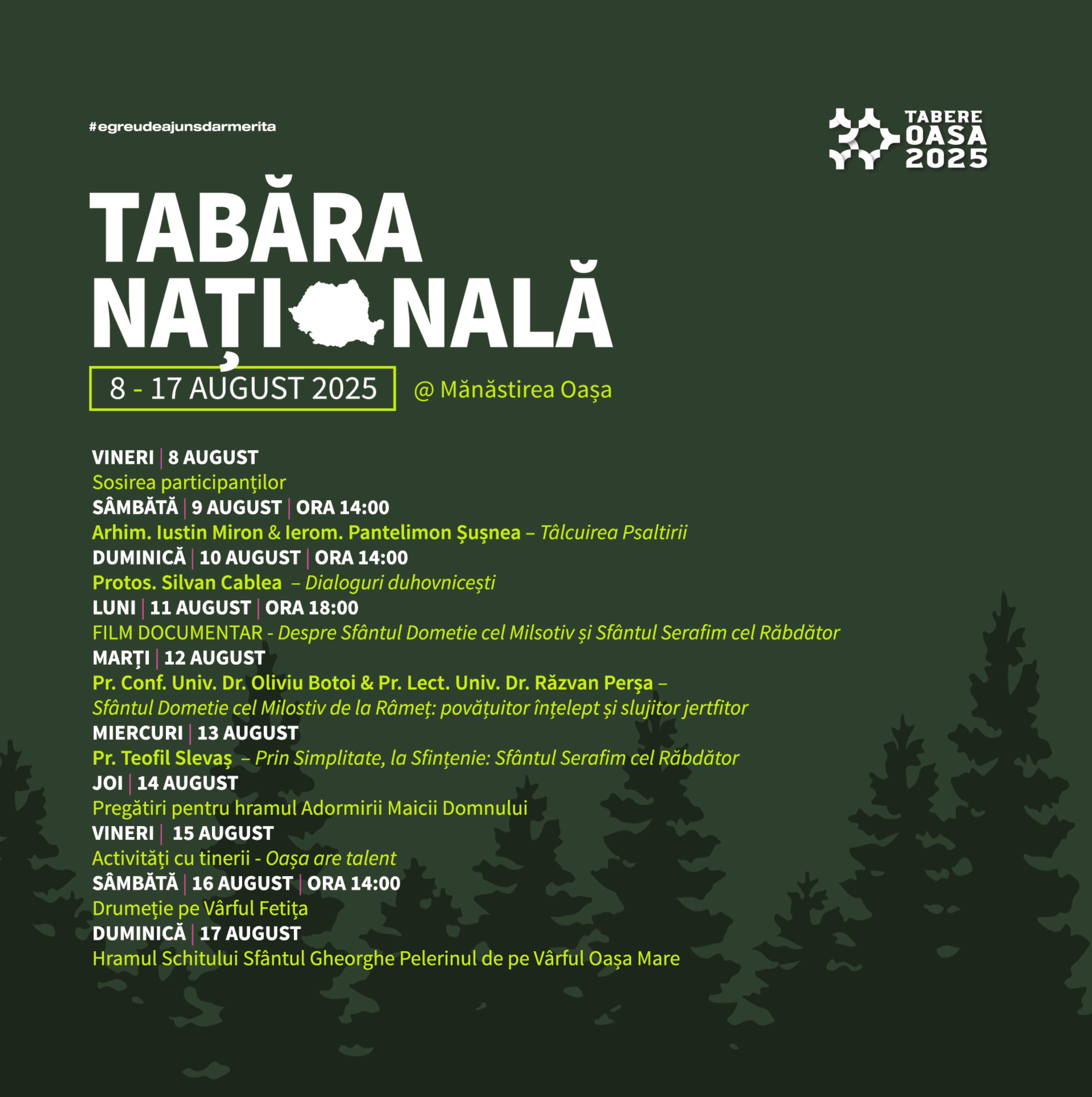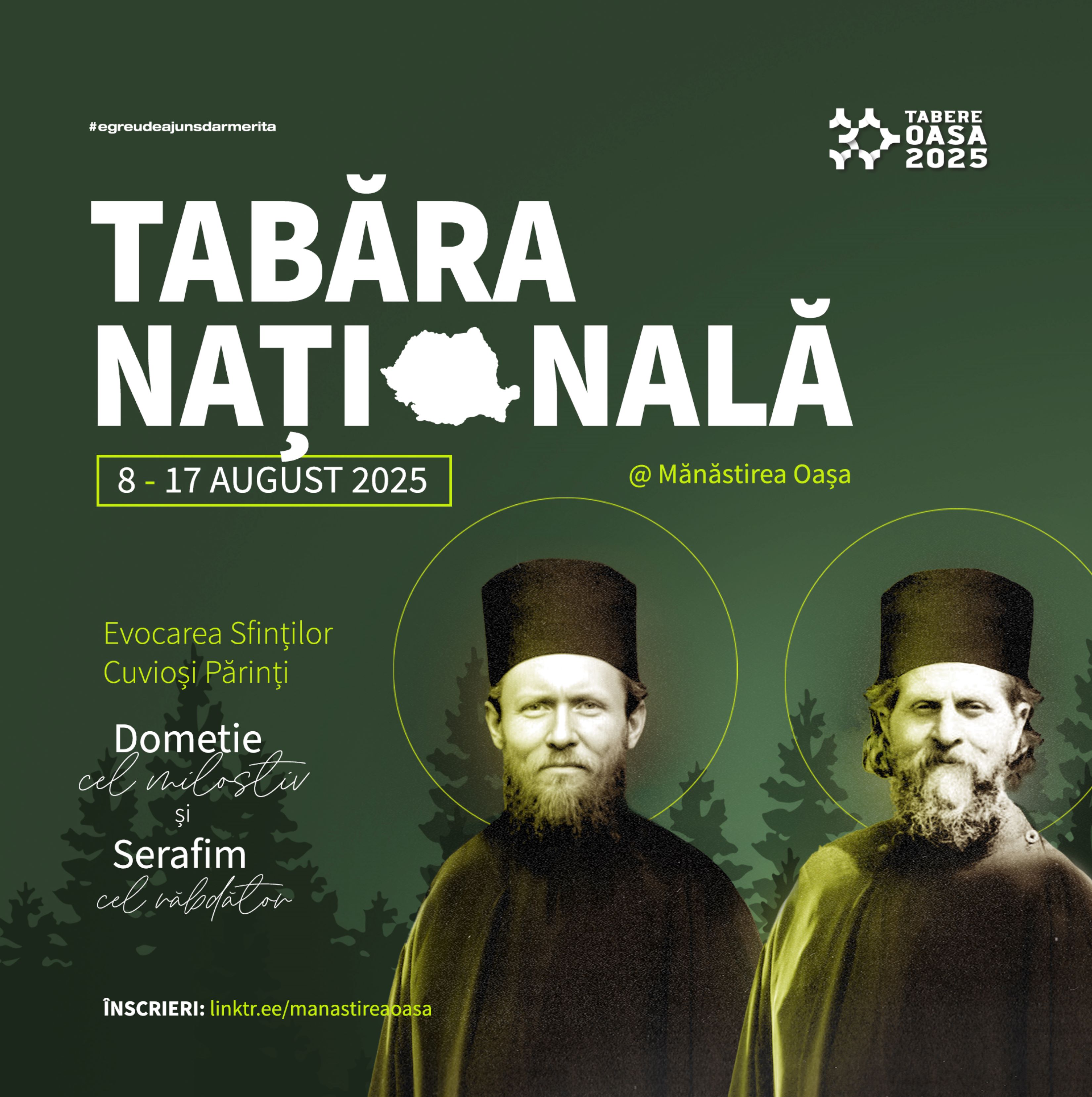 De asemenea, din programul Taberei Naționale de la Oașa nu vor lipsi nici proiecțiile de filme și documentare, prin intermediul cărora vor fi prezentate viețile celor doi sfinți români. Pe parcursul zilelor, participanții vor efectua mai multe drumeții și activități recreative, dar se vor implica și în programul liturgic al Mănăstirii, luând parte, în data de 17 august, la hramul Schitului „Sfântul Gheorghe Pelerinul” de pe Vârful Oașa Mare. Anul trecut, Tabăra Națională de la Oașa a fost dedicată părintelui Dionisie Ignat de la Colciu și părintelui Petroniu Tănase, două figuri românești ce s-au remarcat în viața monahală din Muntele Athos. Pentru înscrieri, vă stă la dispoziție formularul online de pe pagina de Facebook a Mănăstirii Oașa: linktr.ee/manastireaoasa.