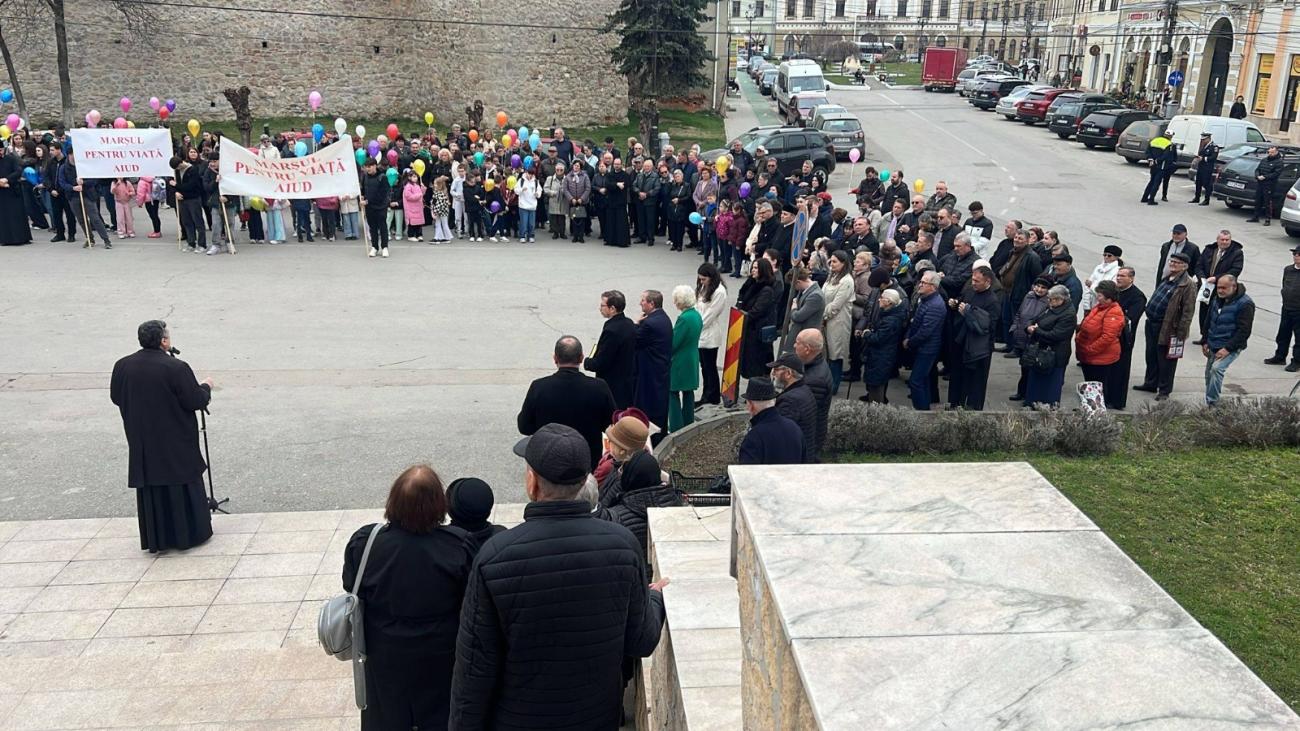 Miercuri, 25 martie 2026, zi de aleasă sărbătoare pentru creștini – praznicul Bunei Vestiri – a devenit, și în municipiul Aiud, un prilej de mărturisire publică a valorilor creștine și a respectului pentru viață, ca dar suprem primit de la Dumnezeu. Încă din anul 2011, această zi a căpătat, la nivel național, semnificația unei mobilizări comune, reunind în numeroase orașe din România credincioși de toate vârstele – preoți, elevi, profesori și familii – într-o manifestare dedicată afirmării dreptului la viață al fiecărei ființe umane, încă din prima clipă a existenței sale. În acest cadru, municipiul Aiud s-a alăturat, în ultimii ani, acestei mișcări, devenind parte vie a unei mărturisiri comune pentru viață. Într-o societate românească aflată adesea între tentația secularizării și rădăcinile sale creștine, Marșul pentru Viață reprezintă o mărturie vie că valorile Evangheliei nu și-au pierdut actualitatea. Participanții au afirmat cu tărie că viața nu este o întâmplare, ci un dar, iar fiecare om – născut sau nenăscut – are dreptul fundamental de a trăi.