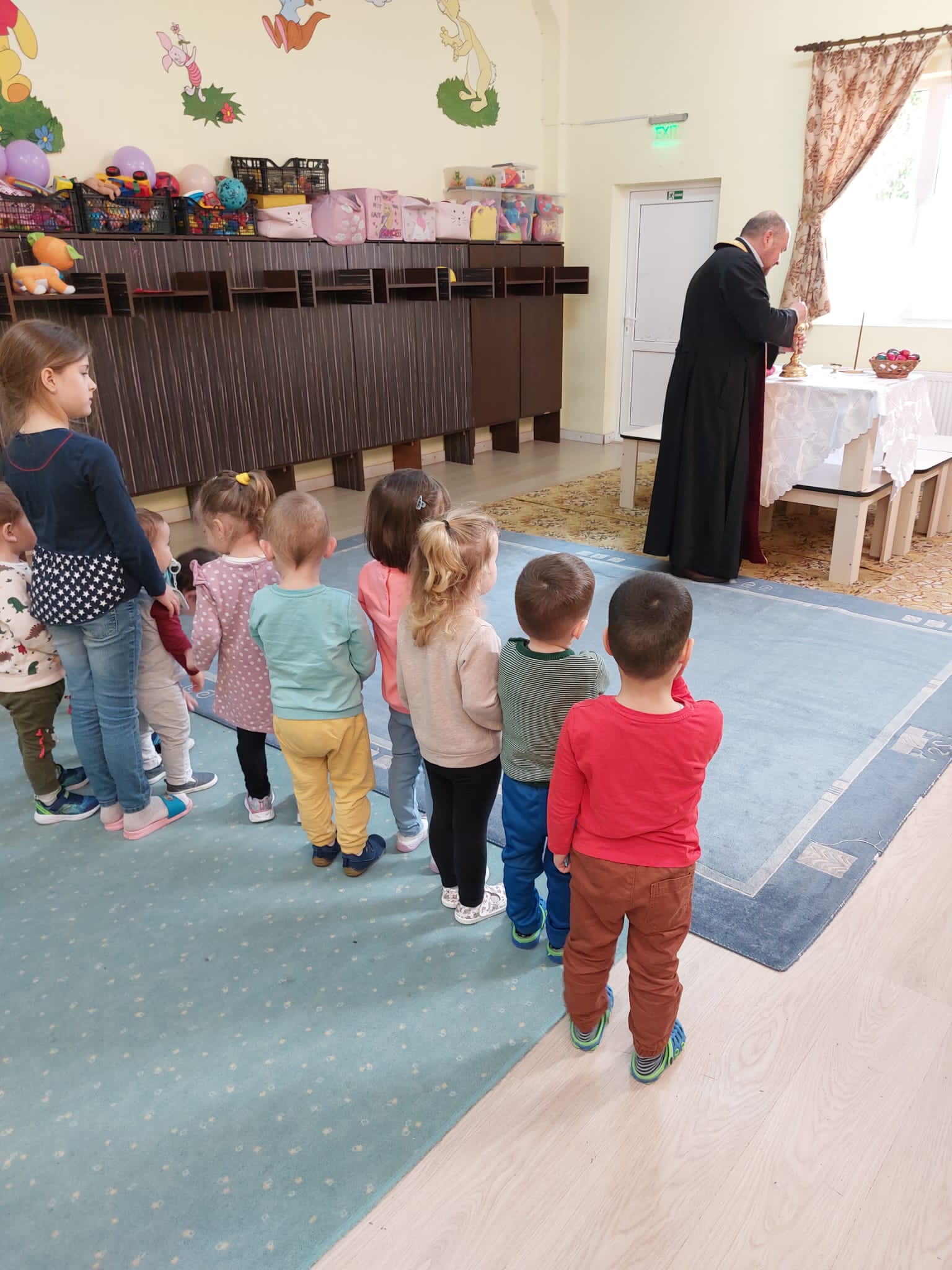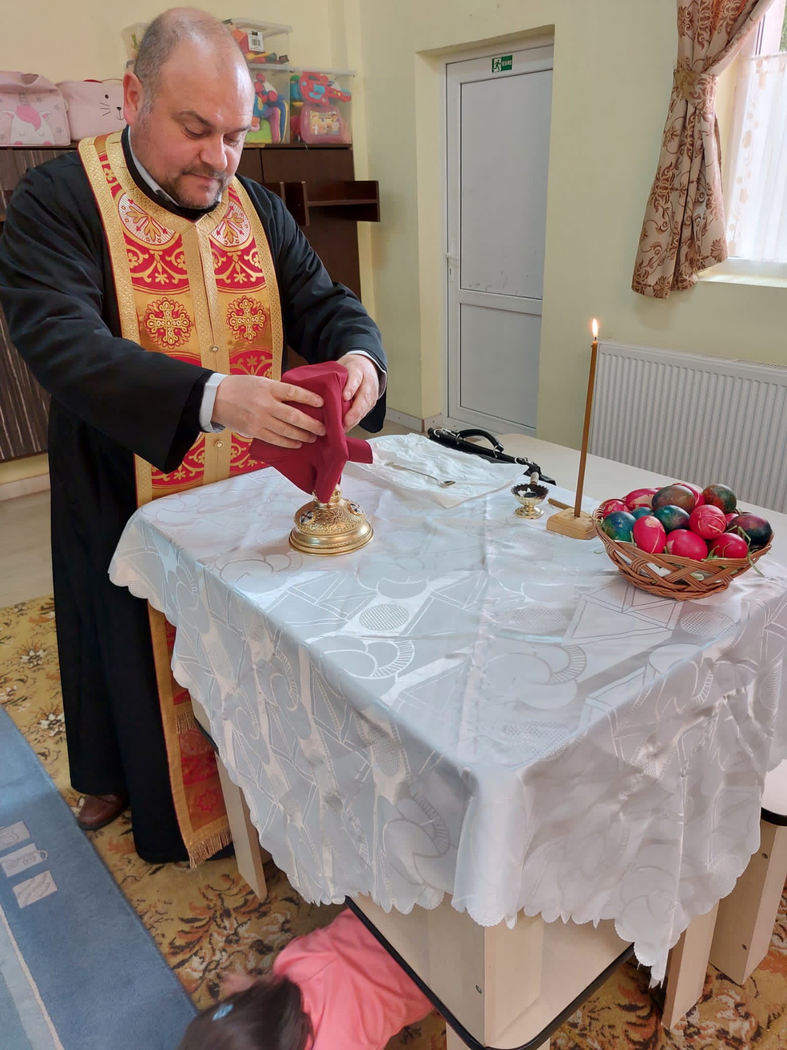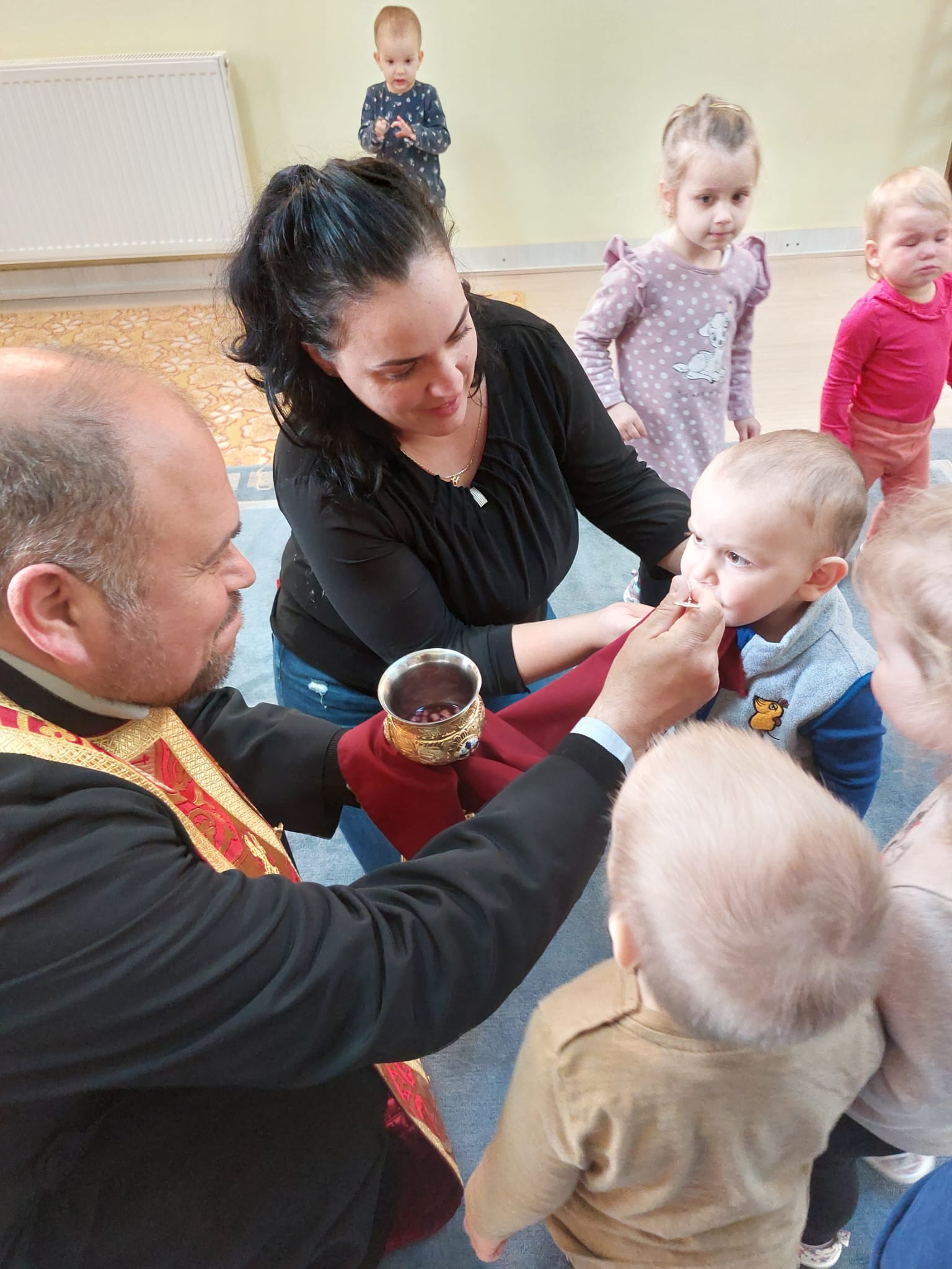 În Săptămâna Patimilor, copiii de la Centrul de Zi pentru copii antepreşcolari „Sfânta Irina” din Blaj au fost împărtășiți cu Trupul și Sângele Mântuitorului de către coordonatorul centrului, părintele Vasile Seicean.