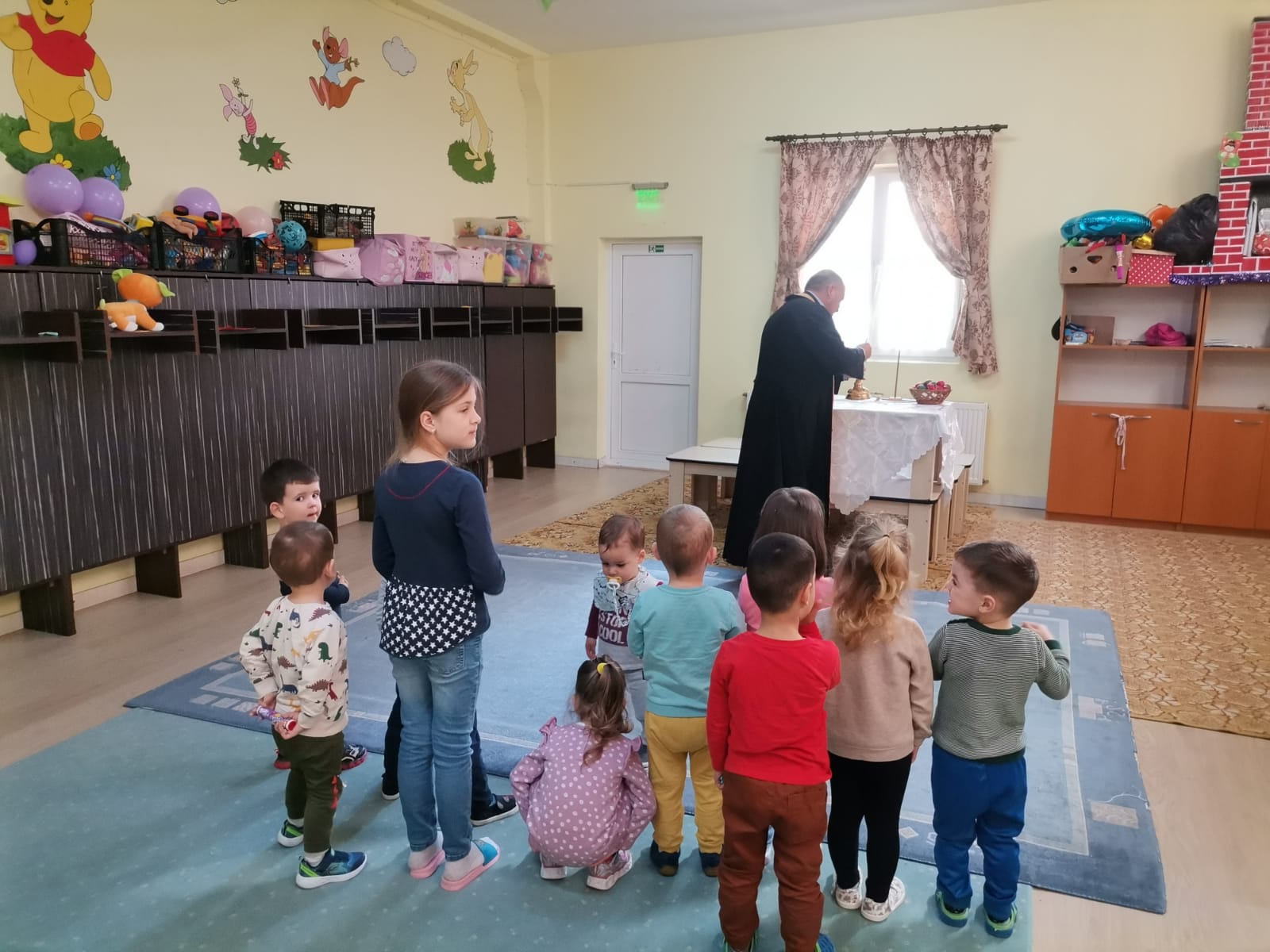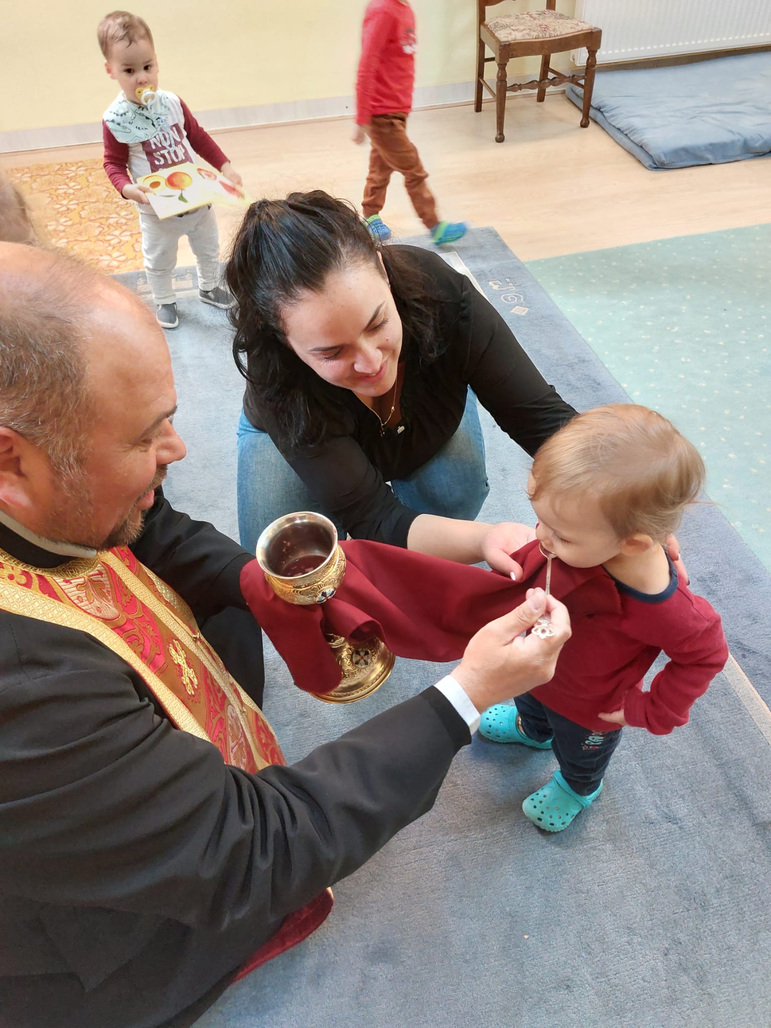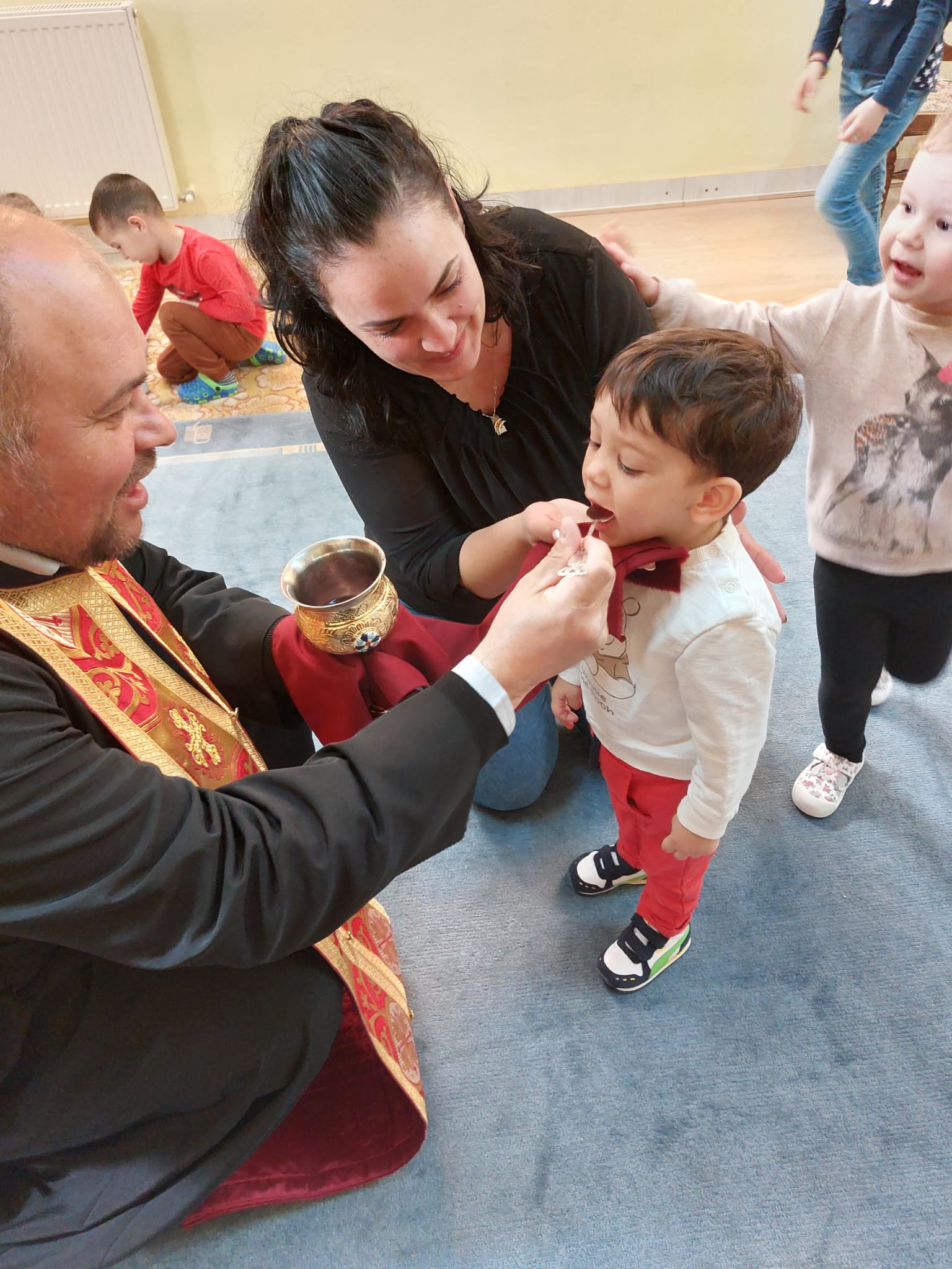 În Săptămâna Patimilor, copiii de la Centrul de Zi pentru copii antepreşcolari „Sfânta Irina” din Blaj au fost împărtășiți cu Trupul și Sângele Mântuitorului de către coordonatorul centrului, părintele Vasile Seicean.