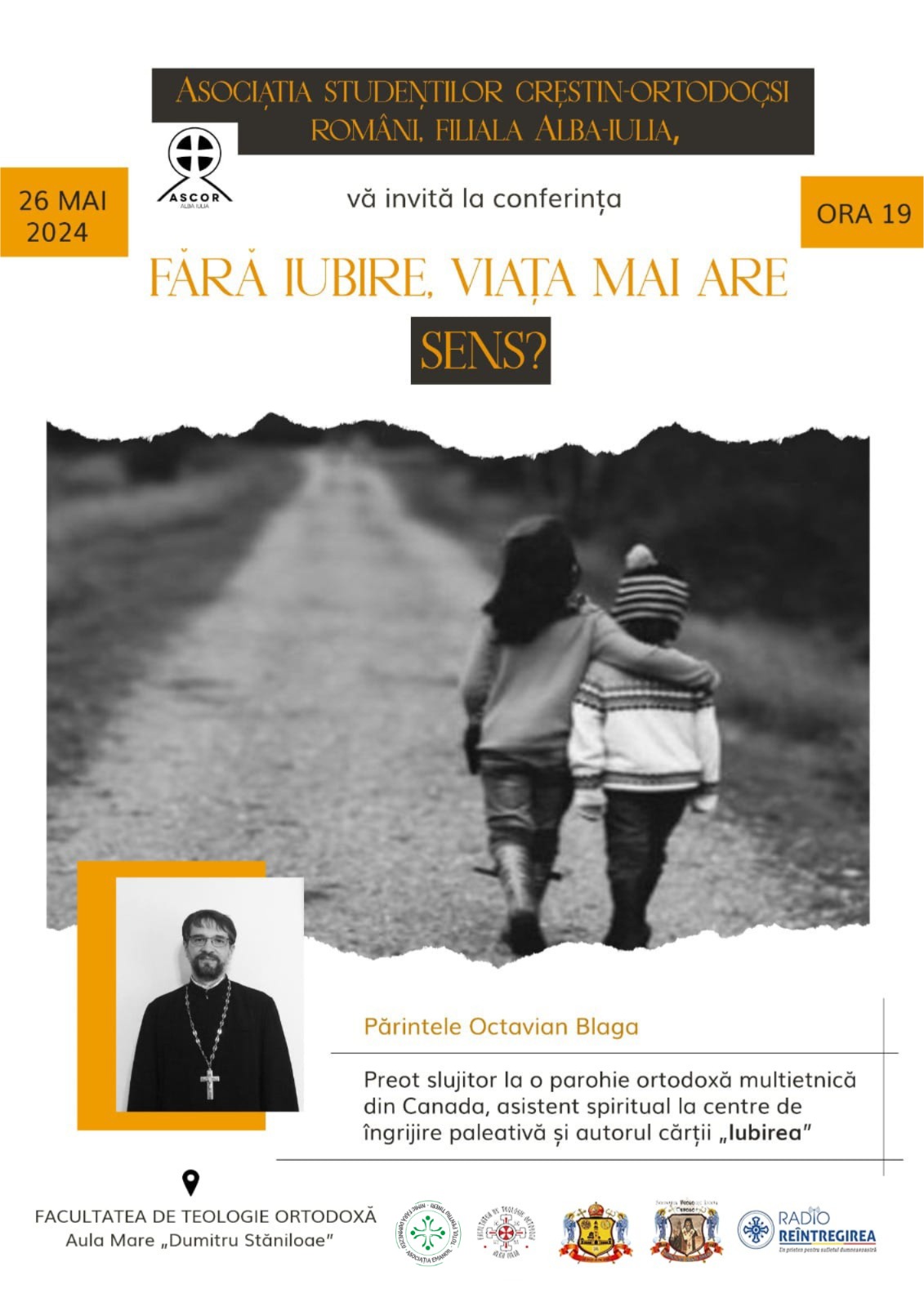 Asociația Studenților Creștin-Ortodocși Români – Filiala Alba Iulia va organiza duminică, 26 mai 2024, o nouă conferință duhovnicească. Evenimentul, programat de la ora 19.00, în Aula Mare „Dumitru Stăniloae” a Facultății de Teologie Ortodoxă din Alba Iulia, îl va avea ca invitat special pe părintele Octavian Blaga, preot slujitor în cadrul unei parohii ortodoxe multietnice aflate sub jurisdicția Bisericii Ortodoxe din America (O.C.A.). Sub nimbul luminos al perioadei liturgice a Penticostarului, sfinția sa va susține conferința intitulată „Fără iubire, viața mai are sens?”. Stabilit în Quebec (Canada), părintele Octavian Blaga este recunoscut pentru misiunea nobilă pe care o îndeplinește ca asistent spiritual în cadrul mai multor centre de îngrijire paleativă. De asemenea, sfinția sa este autorul cărții intitulate sugestiv „Iubirea”, apărută în anul 2021.
