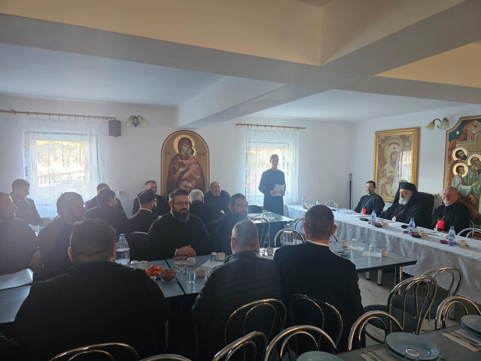 Derularea propriu-zisă a conferinței preoțești a avut loc în trapeza Mănăstirii, lucrările fiind prezidate de către Arhipăstorul nostru. Evenimentul s-a desfășurat sub genericul „Despre pace și război în lumina teologiei ortodoxe”, având în vedere importanța și actualitatea acestui subiect sensibil în societatea zilelor noastre. Referatul din cadrul întrunirii a fost susținut de către părintele Constantin Rohan, preot al parohiei Zagăr, protopopiatul Sighișoara. La final, Înaltpreasfințitul Părinte Irineu le-a adresat preoților îndemnuri duhovnicești și cuvinte folositoare de suflet. Protoierei ai celor două protopopiate sunt părintele Ovidiu Dan (Sighișoara) și părintele Sergiu Dumitru (Târnăveni).