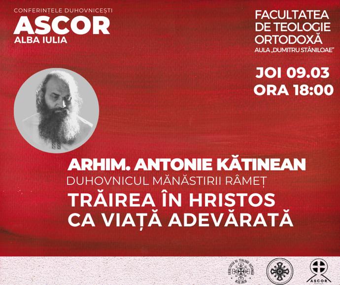 Cu binecuvântarea Înaltpreasfințitului Părinte Irineu, Arhiepiscop al Alba Iuliei, în perioada Postului Mare, ASCOR – Filiala Alba Iulia organizează, ca în fiecare an, o serie de conferințe duhovnicești. Prima întâlnire din acest an se va desfășura joi, 9 martie 2023, avându-l ca invitat special pe Părintele Arhimandrit Antonie Kătinean, duhovnicul Mănăstirii Râmeț, care va susține conferința intitulată „Trăirea în Hristos ca viață adevărată”.