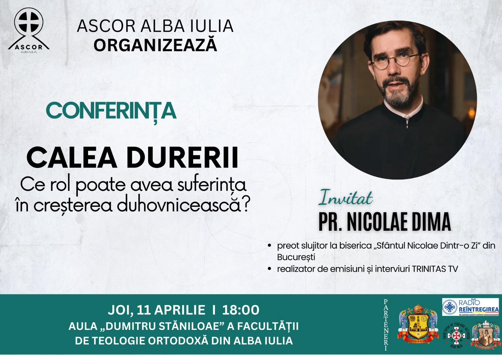 Cu binecuvântarea Înaltpreasfințitului Părinte Irineu, Arhiepiscop al Alba Iuliei, în perioada Postului Sfintelor Paști, Asociația Studenților Creștin-Ortodocși Români (ASCOR) – Filiala Alba Iulia organizează, ca în fiecare an, o serie de conferințe duhovnicești. A doua întâlnire din acest post se va desfășura joi, 11 aprilie 2024, avându-l ca invitat special pe părintele Nicolae Dima, care va rosti teologilor albaiulieni o meditație despre „Calea durerii. Ce rol poate avea suferința în creșterea duhovnicească?”.