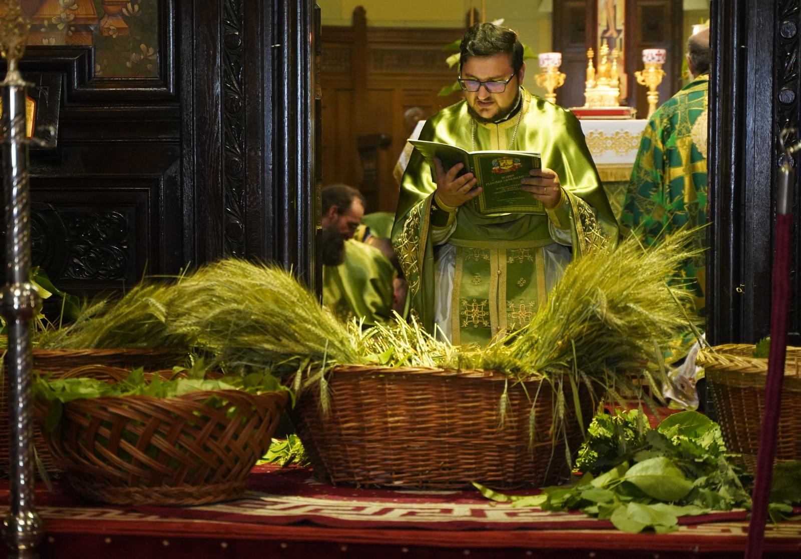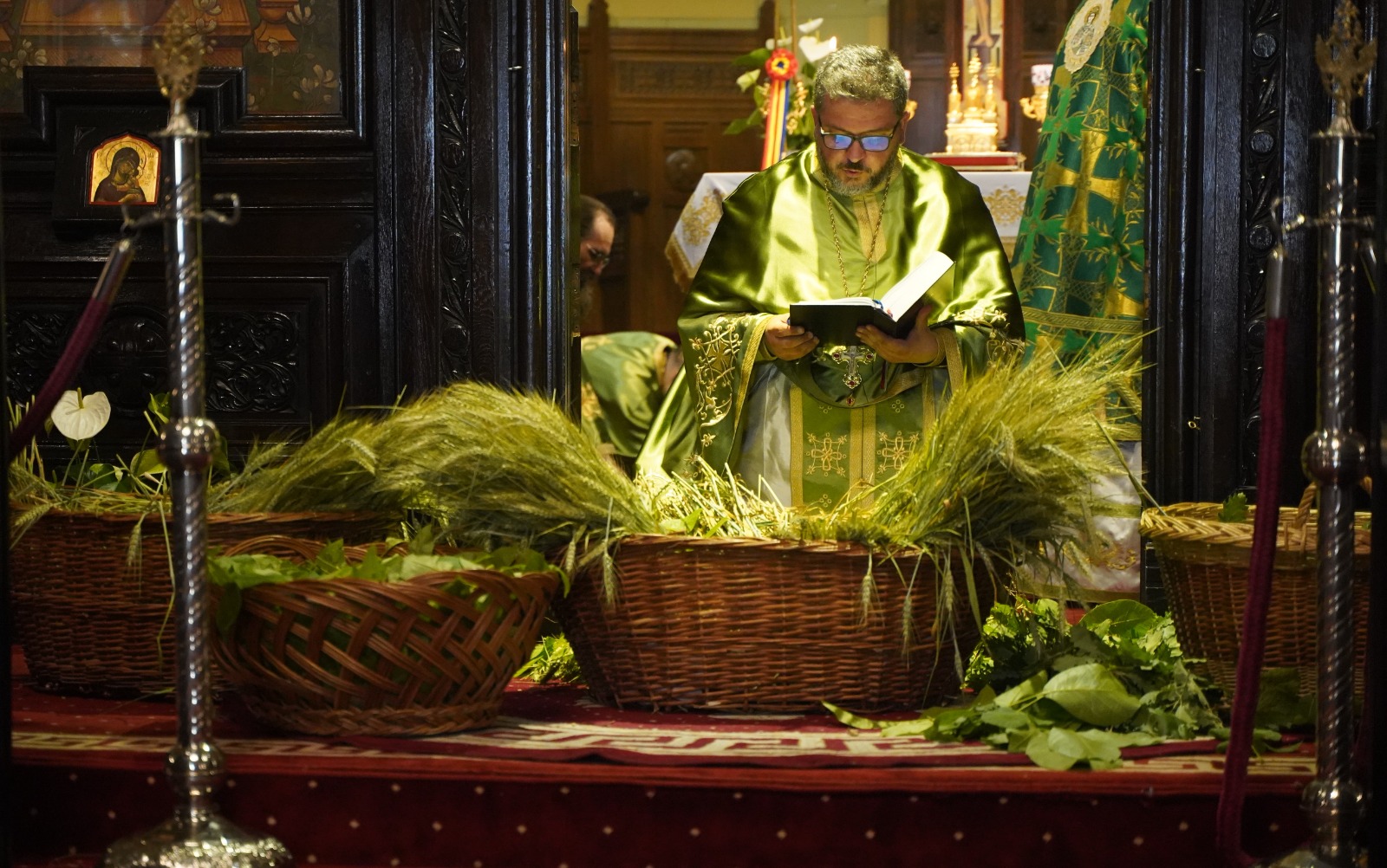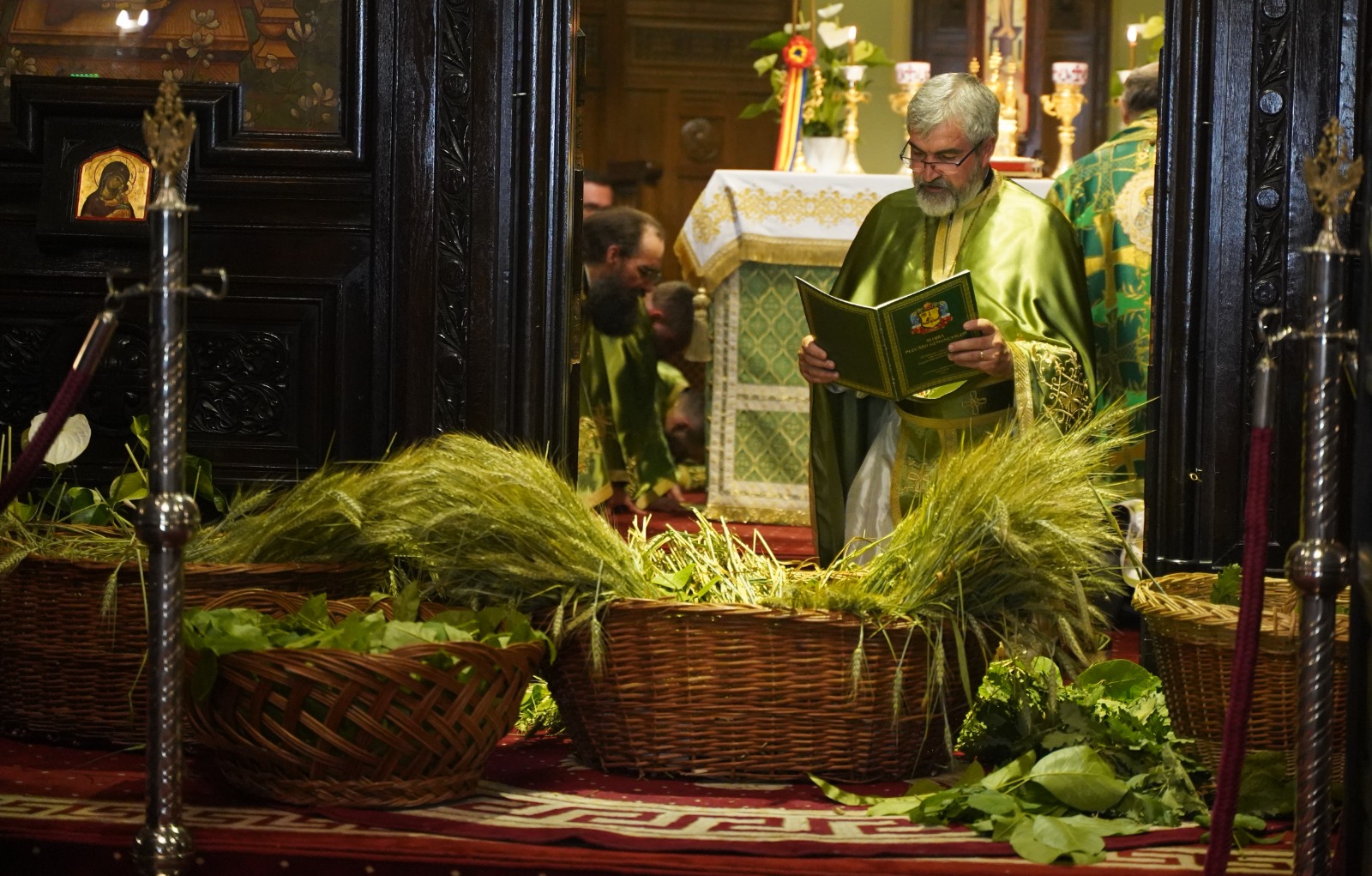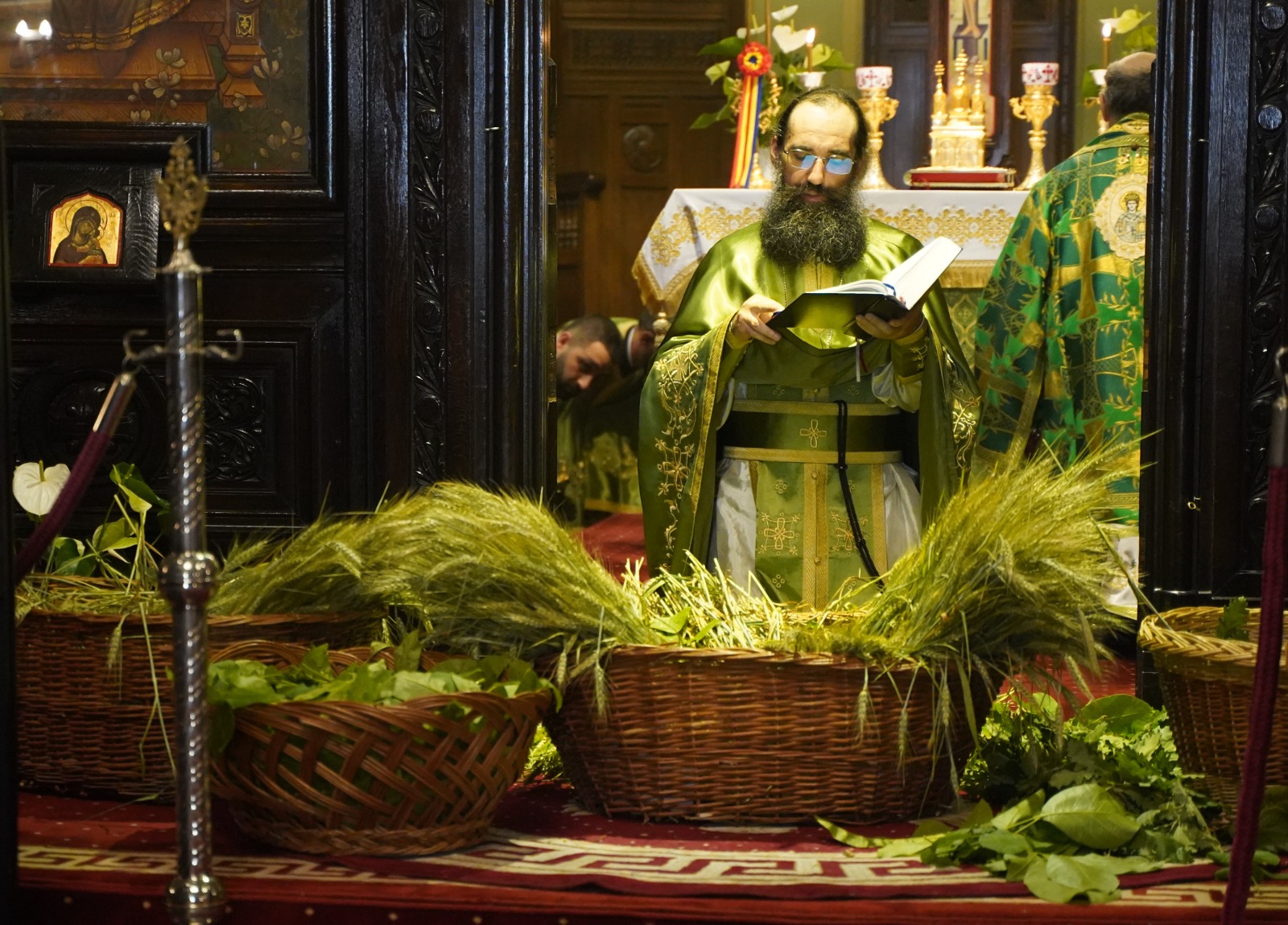 După oficierea Sfintei Liturghii, Arhipăstorul nostru a săvârșit slujba Vecerniei plecării genunchilor, în cadrul căreia au fost citite șapte rugăciuni închinate Sfintei Treimi. Aceste invocări speciale amintesc de cele șapte daruri ale Duhului Sfânt care au fost revărsate asupra Sfinților Apostoli în ziua Cincizecimii. De asemenea, au fost binecuvântate ramurile de nuc și spicele de grâu, acestea fiind împărțite mai apoi tuturor credincioșilor prezenți.