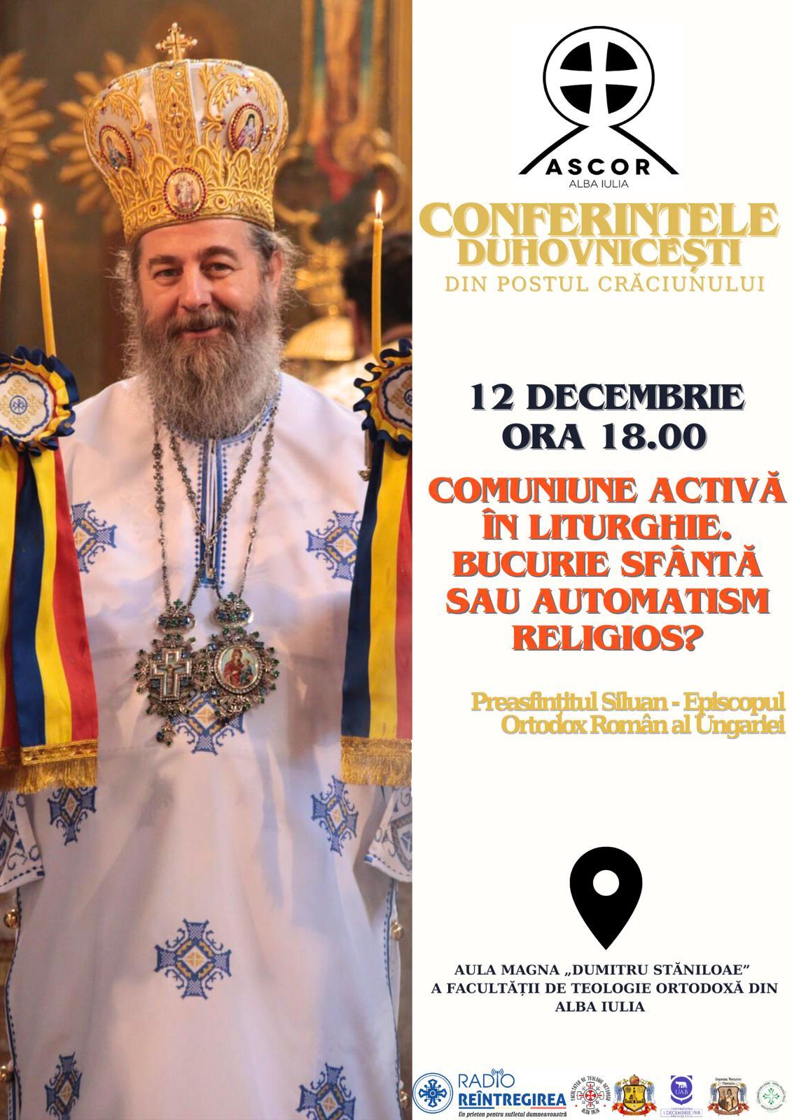 Joi, 12 decembrie 2024, începând cu ora 18.00, se va desfășura ultima conferință duhovnicească organizată de ASCOR Alba Iulia în Postul Crăciunului. Evenimentul îl va avea ca invitat special pe Preasfințitul Părinte Siluan, Episcopul Ortodox Român al Ungariei. Ierarhul va susține prelegerea intitulată „Comuniune activă în Liturghie. Bucurie sfântă sau automatism religios?”. Conferința va avea loc în Aula Mare „Dumitru Stăniloae” din incinta Facultății de Teologie Ortodoxă din Alba Iulia.