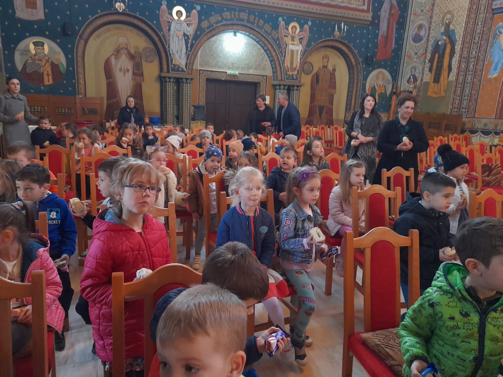 70 de copii, din grupele mari, mijlocii şi mici de la Grădiniţa cu Program Prelungit nr. 4 din Târnăveni, însoţiţi de către directorul instituției de învățământ Gabriela Luciana Antal şi doamnele educatoare Anca Moga, Călina Dreghici, Iulia Cândea, Valentina Găinar şi Valentina Sălcudean, s-au bucurat de momentul participării la rugăciunea comună a Bisericii, în cadrul Parohiei Ortodoxe Târnăveni II, alături de părintele paroh Alin Iernuţan.