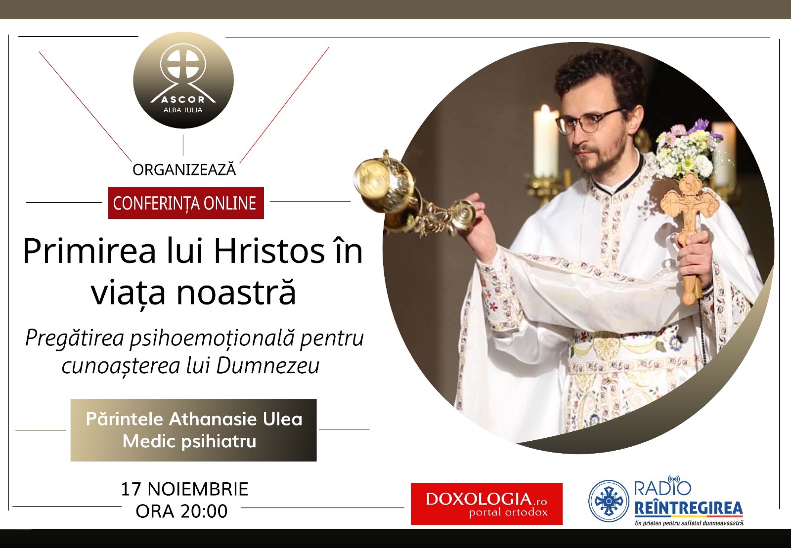 Cu binecuvântarea Înaltpreasfințitului Părinte Irineu, Arhiepiscop al Alba Iuliei, în perioada Postului Crăciunului, ASCOR – Filiala Alba Iulia organizează o serie de conferințe duhovnicești în mediul online. Prima întâlnire se va desfășura miercuri, 17 noiembrie 2021, avându-l ca invitat special pe părintele Athanasie Ulea, medic psihiatru și preot misionar în cadrul centrului bisericesc din München. Sfinția sa va susține conferința intitulată „Primirea lui Hristos în viața noastră: Pregătirea psihoemoțională pentru cunoașterea lui Dumnezeu”.