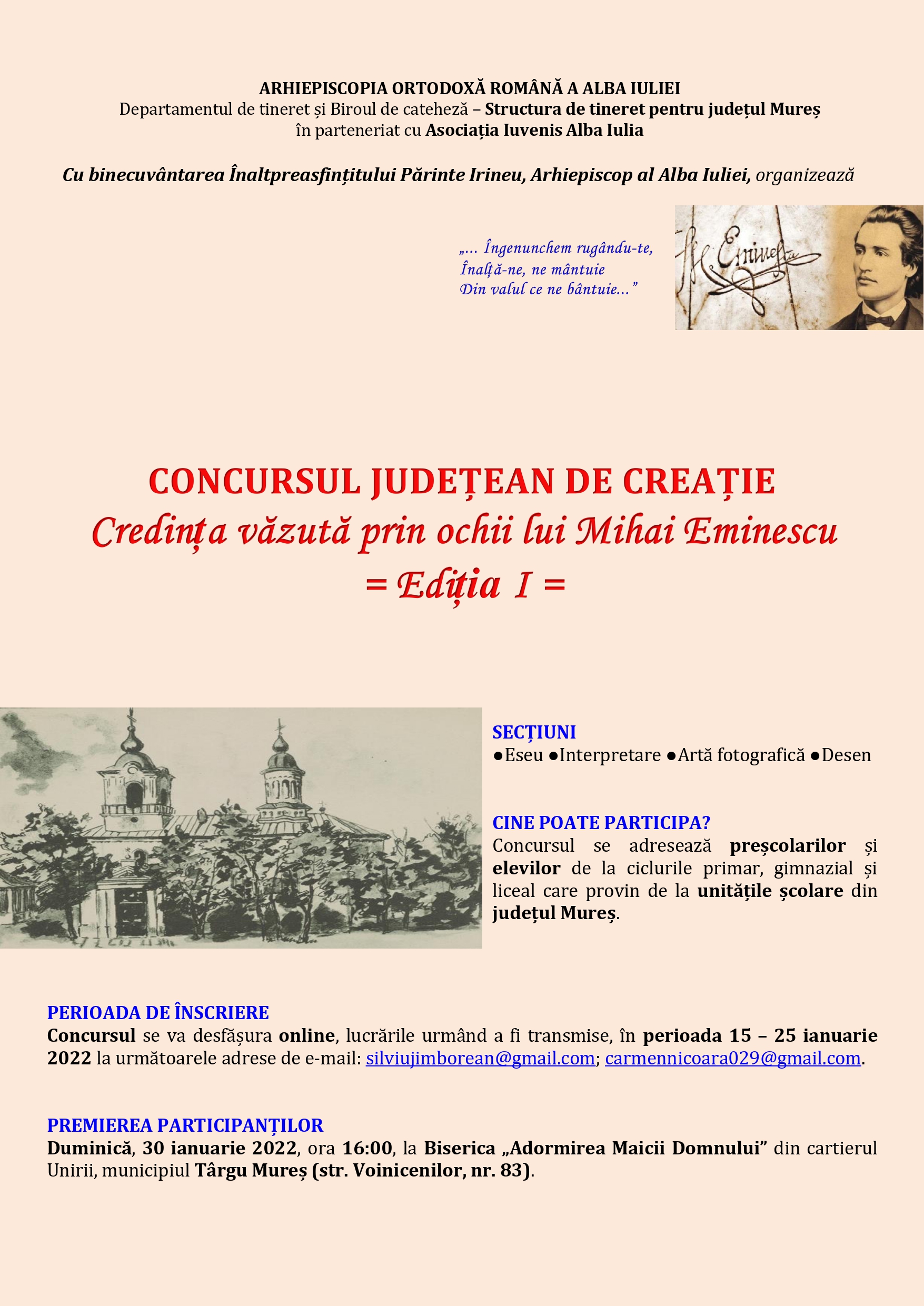 Cu binecuvântarea Înaltpreasfințitului Părinte Irineu, Arhiepiscopia Ortodoxă Română a Alba Iuliei, prin Departamentul de tineret și Biroul de cateheză – Structura de misiune și tineret din județul Mureș, în parteneriat cu Aociația „Iuvenis” Alba Iulia, organizează, în județul Mureș, concursul județean de creație intitulat „Credința văzută prin ochii lui Mihai Eminescu”.