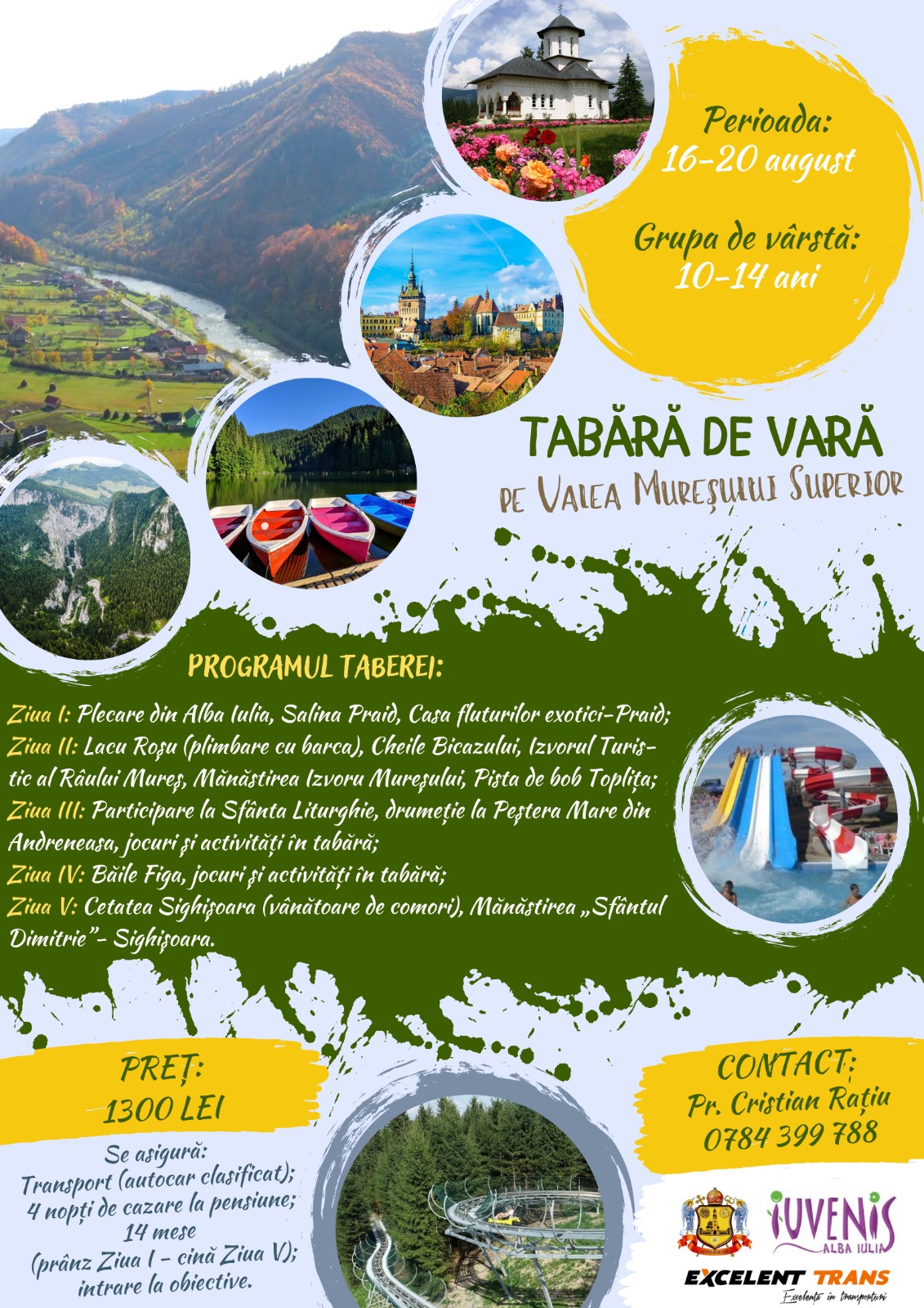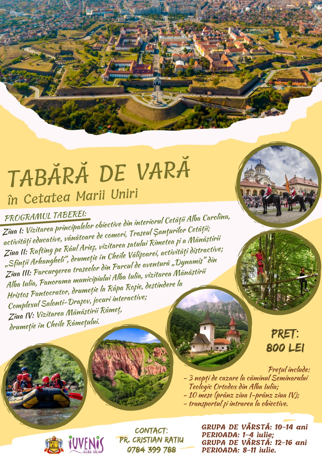 În perioadele 1-4 iulie și 8-11 iulie, se vor desfășura la Alba Iulia două serii de tabere. Prima este dedicată grupei de vârstă 10-14 ani, iar cea de-a doua grupei 12-16 ani. Programul va pune accentul pe descoperirea, într-o manieră distractivă, a obiectivelor principale din interiorul Cetății Alba Carolina și dintre zidurile care o împrejmuiesc. De asemenea, vom vizita Mănăstirea Hristos Pantocrator, vom urca la panorama municipiului și vom parcurge traseele din parcul de aventură „Dynamis”. Într-una dintre zile vom avea parte de o experiență cu multă adrenalină pe râul Arieș, unde vom face rafting. La întoarcere, vom vizita satul Rimetea și mănăstirile din apropiere, după care vom efectua o scurtă drumeție pe unul dintre versanții din Cheile Aiudului. Programul cuprinde și vizitarea rezervației Râpa Roșie, de lângă Sebeș, și o destindere în cadrul Complexului balnear de la Drașov. În ultima zi a taberei ne vom reculege la Mănăstirea Râmeț și vom parcurge traseul cheilor săpate în stânci de apele repezi ale Văii Geoagiului.