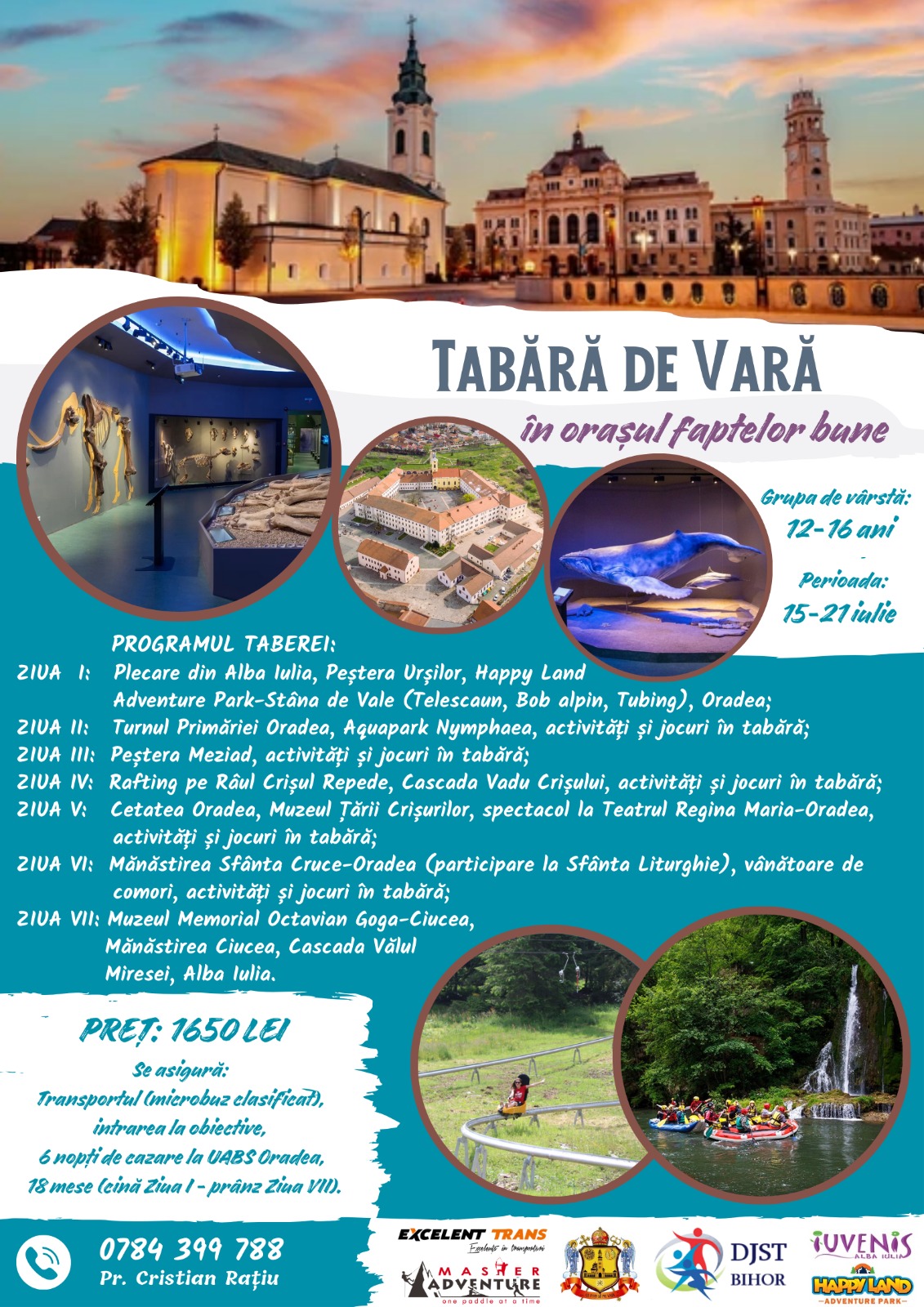În perioada 15-21 iulie, vom avea o tabără complexă în județul Bihor. Cazarea se va face în centrul Oradiei, ceea ce ne oferă posibilitatea de a vizita obiectivele reprezentative ale orașului, între care amintim: Turnul Primăriei, Cetatea Oradea și Muzeul Țării Crișurilor. De asemenea, vom lua parte la un spectacol de teatru și ne vom relaxa în Parcul acvatic „Nymphaea”. Totodată, propunem și o serie de activități în afara orașului, pe care le considerăm extrem de interesante. Vom vizita cele mai renumite peșteri din zonă, și anume Peștera Urșilor și nou amenajata peșteră Meziad. De asemenea, vom efectua o tură cu telescaunul, vom coborî cu bobul și ne vom da drumul pe pârtia de tubing în stațiunea Stâna de Vale. Cu siguranță, activitatea de maxim interes a taberei va fi parcurgerea în bărci pneumatice a distanței de aproximativ 10 km, pe care Crișul Repede o străbate între Peștera Unguru Mare și localitatea Vadu Crișului, porțiune pe care se află Defileul Crișului Repede și Cascada Vadu Crișului. Bineînțeles, programul va cuprinde și vizitarea unor biserici și mănăstiri, cum ar fi: biserica cu lună din centrul Oradiei, Mănăstirea „Sfânta Cruce” și Mănăstirea Ciucea, care se află în imediata vecinătate a Muzeului memorial „Octavian Goga”.