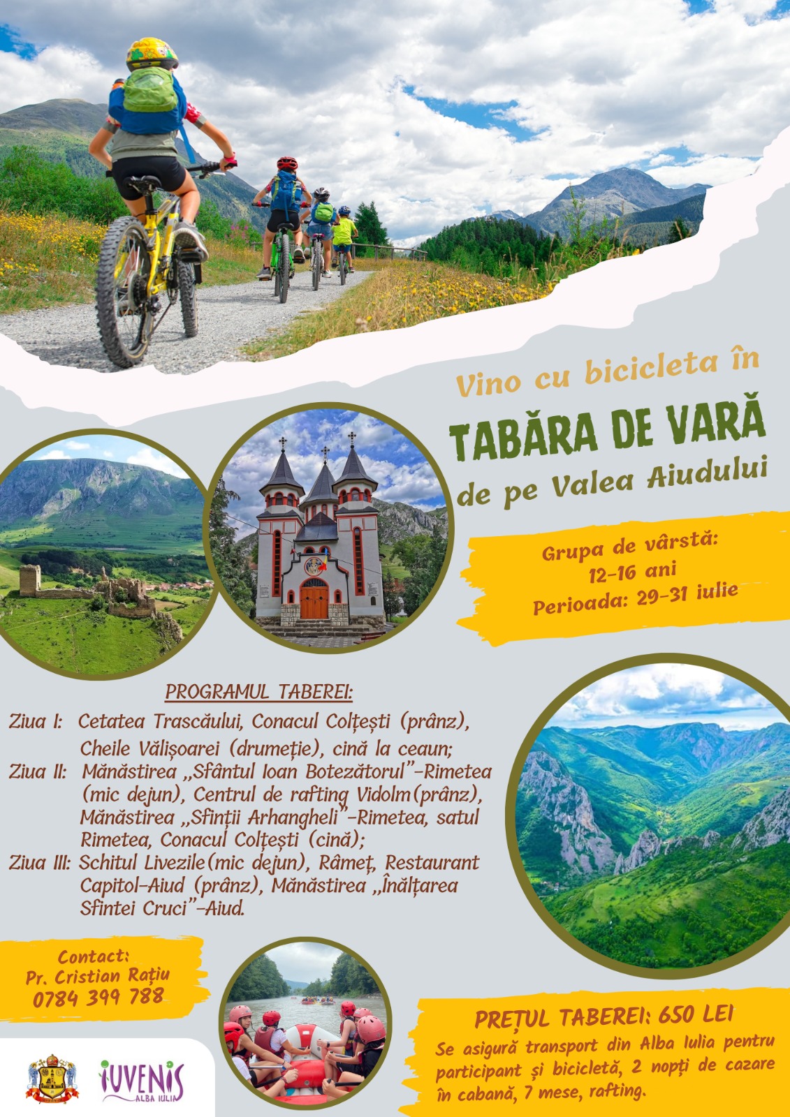 La sfârșitul lunii, în perioada 29-31 iulie, debutăm cu un nou tip de tabără. Vom organiza pentru prima dată o tabără de biciclete. Am ales ca zonă de desfășurare Valea Aiudului, pentru multitudinea de obiective și activități pe care le oferă. Astfel, vom pedala între Cheile Aiudului și masivul Piatra Secuiului, vizitând satele și mănăstirile și efectuând drumeții la Cetatea Trascăului și pe vârfurile munților. De asemenea, vom savura preparatele tradiționale din zonă și vom coborî cu barca pneumatică pe apele Arieșului.