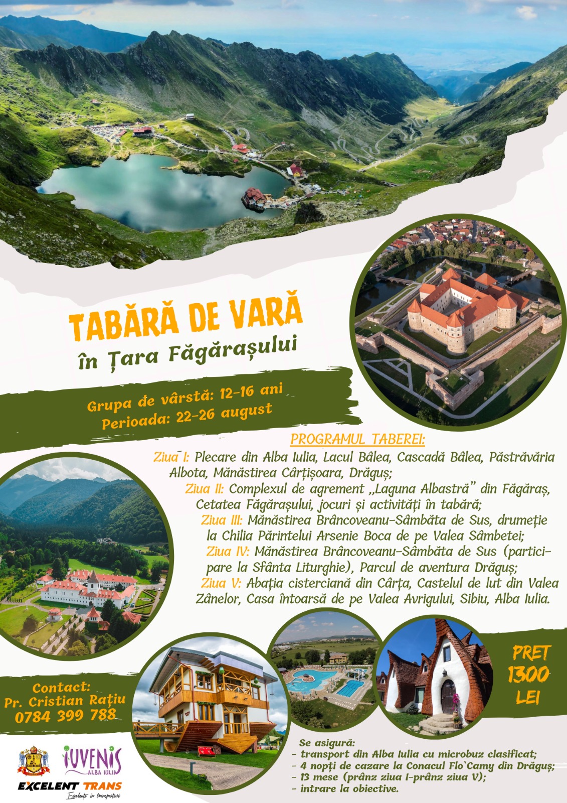Vom încheia proiectul taberelor din acest an cu o ieșire de cinci zile în Țara Făgărașului. Itinerariul va debuta cu o incursiune pe Transfăgărășan, care va cuprinde o plimbare în jurul lacului Bâlea și o scurtă drumeție spre Șaua Caprei. Vom admira cascada Bâlea și ne vom închina la Mănăstirea Cârțișoara. Din program fac parte vizitarea Mănăstirii Brâncoveanu de la Sâmbăta de Sus, a Cetății Făgărașului, a abației cisterciene de la Cârța, a Castelului de lut și a Casei întoarse de pe Valea Avrigului. Ne vom relaxa la Complexul Laguna albastră din Făgăraș, după care ne vom testa rezistența în Parcul de aventură „Drăguș” și în drumeția de pe Valea Sâmbetei, în care vom vizita și chilia Părintelui Arsenie Boca.