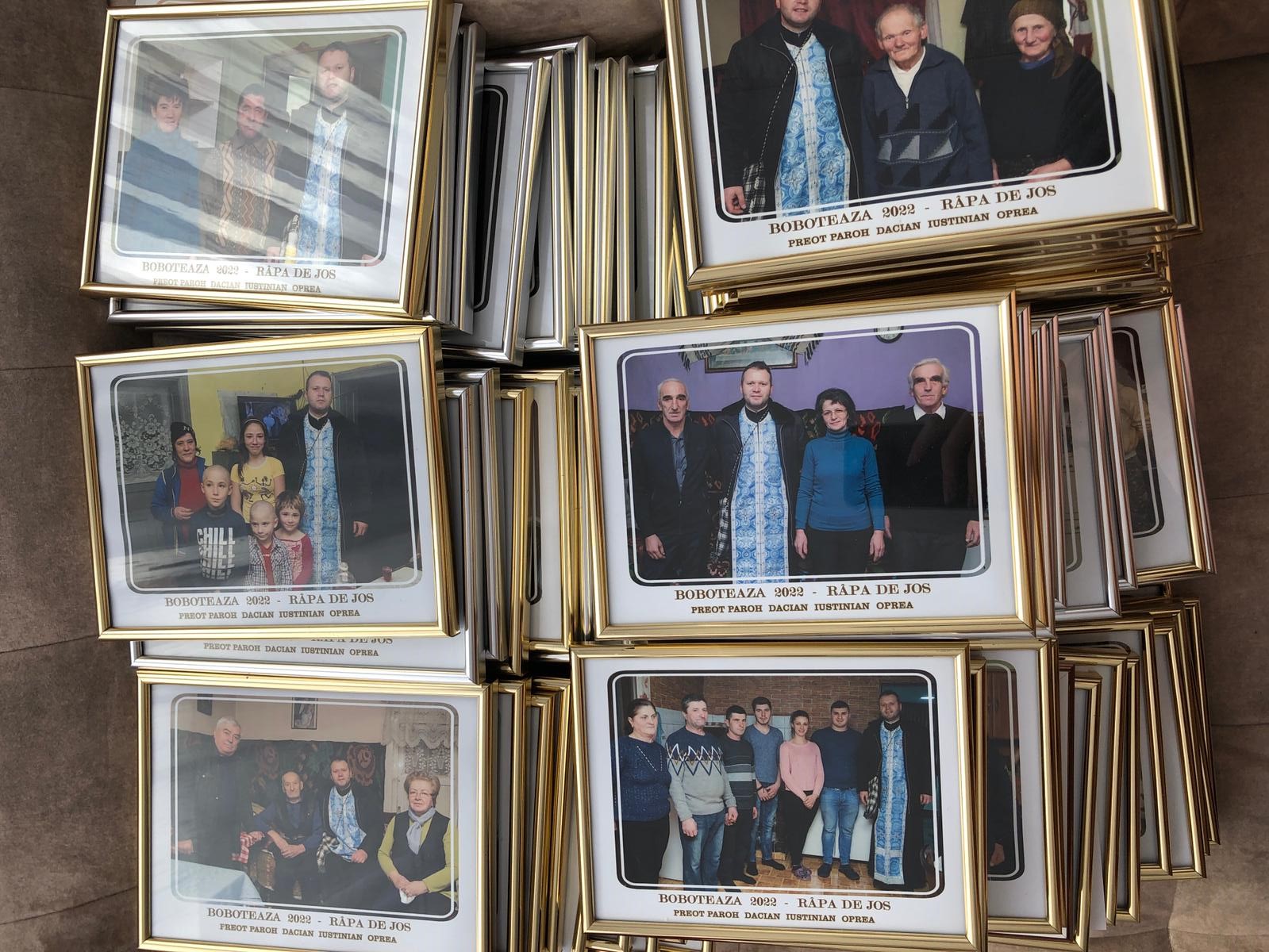 De asemenea, am realizat fotografii cu toţi membrii familiilor care ne-au primit cu botezul, iar în data de 30 ianuarie 2022, după Sfânta Liturghie, le-am oferit în dar tuturor câte un tablou, ca amintire. În acest sens, am pregătit 150 de astfel de tablouri, pe care le-am înmânat enoriaşilor care au participat la slujbă, iar celor care dintr-un motiv sau altul nu au putut să ne onoreze cu prezenţa, le-am trimis acest dar acasă.