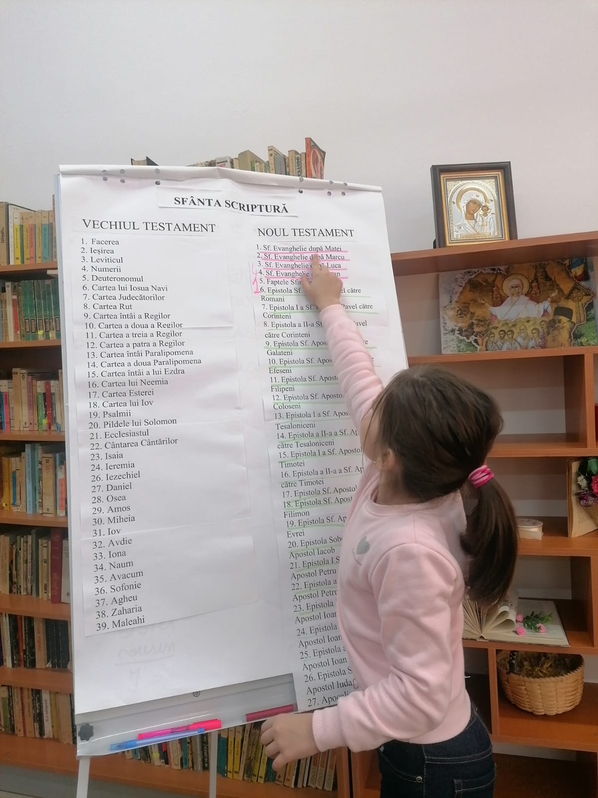 Ziua de luni, 13 noiembrie, a fost dedicată Sfântului Apostol și Evanghelist Matei. Marți, 14 noiembrie, a fost o zi dedicată Sfântului Apostol și Evanghelist Marcu. De asemenea, miercuri, 15 noiembrie, a fost reperat Sfântul Apostol și Evanghelist Luca, iar ziua de joi, 16 noiembrie, i-a fost dedicată Sfântului Apostol și Evanghelist Ioan. Nu în ultimul rând, vineri, 17 noiembrie, s-a discutat despre cartea numită „Faptele Apostolilor”. Activitățile au debutat cu rostirea rugăciunii, după care avea loc lecturarea unui capitol la alegere din cărțile Sfintei Scripturi. Astfel, elevii au fost antrenați într-o mică discuție despre cele citite și cuvintele ziditoare care trebuie puse la suflet, dar și despre cum pot fi acestea împlinite în faptă. Un alt aspect al acestui proiect a fost constituit de activitatea intitulată „Sfânta Scriptură prin ochi de copil”, care a cuprins desene realizate de către elevi în cadrul orelor de Religie.