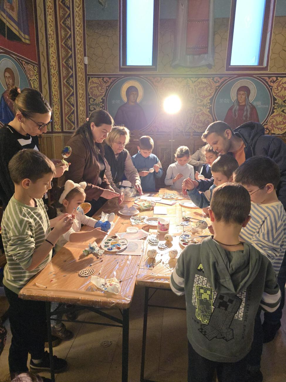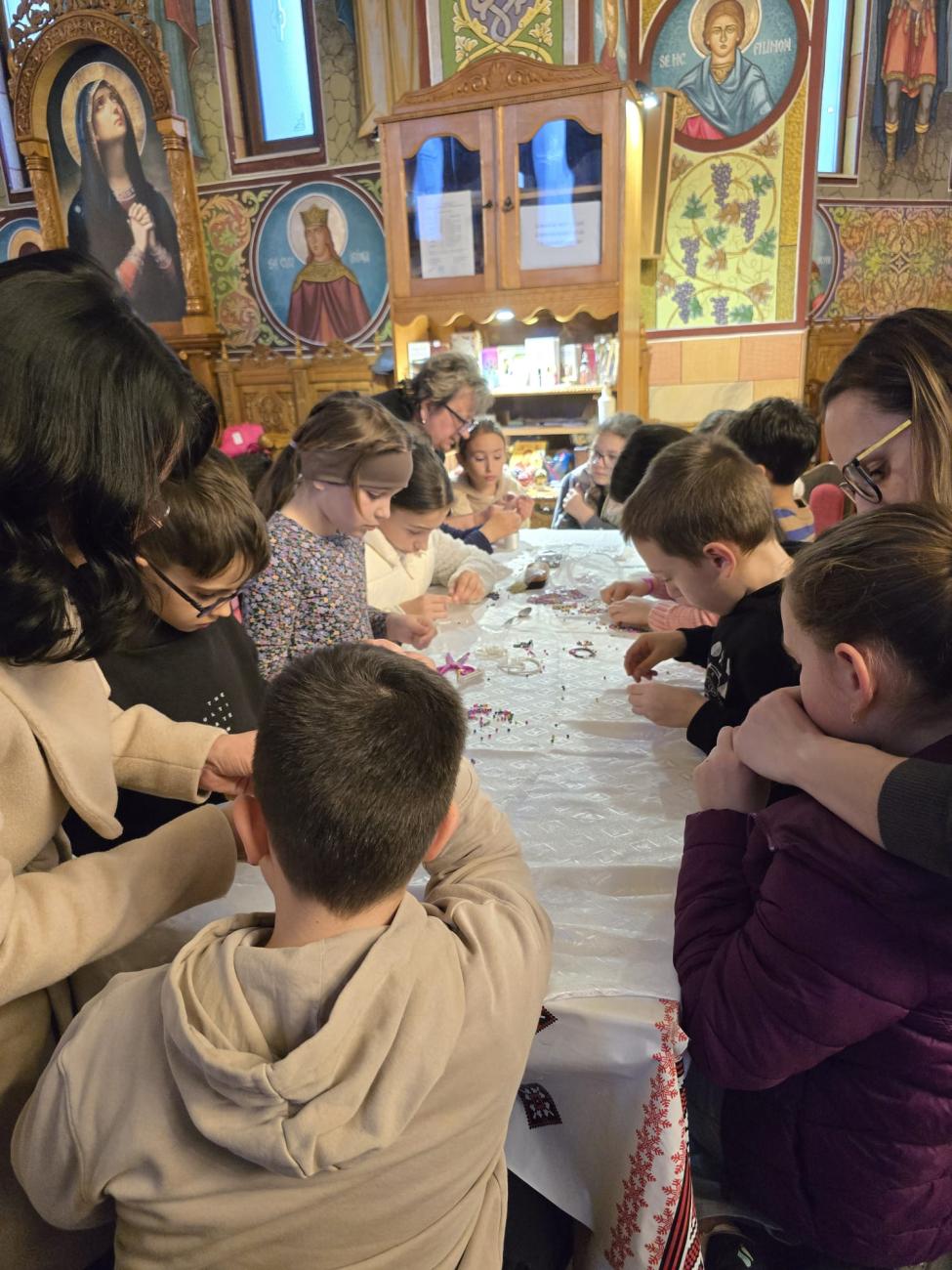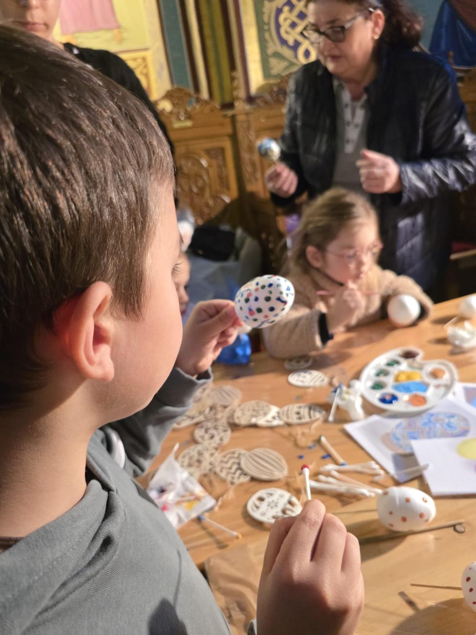 În cadrul workshop-ului tematic „Vopsitul ouălor – credință și tradiție în modernitate”, au avut loc discuții cu tinerii privind tradiția și semnificația vopsitului ouălor: vechimea tradiției de vopsit ouăle, legătura dintre aceasta și Praznicul Învierii Domnului și importanța perpetuării acestui obicei în societatea noastră modernă. Atelierul de decorat și vopsit ouă a reprezentat partea practică a întâlnirii, prilej cu care participanții au vopsit și decorat ouă, magneți de frigider și lumânări prin diverse tehnici: pictură, tehnica șervețelului, tehnica punctului, vopsea creată din plante sau cruciulițe și au confecționat coșulețe din carton pentru ouă. De asemenea, de la doamna Maria Kulcsar, meșter popular, care a dezvoltat o tehnică inovatoare de împodobire a ouălor, inspirată din practicile bucovinene – husa cusută cu mărgele pentru învelirea ouălor, tinerii au avut prilejul de a învăța să decoreze ouăle cu delicatele podoabe, ce vor înfrumuseța orice casă tradițională creștină. În continuare, în cadrul atelierului coordonat de invitata specială a activității, au confecționat îngerași din mărgele.