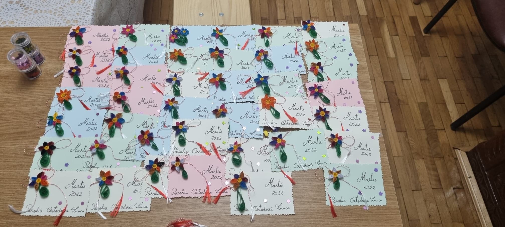 Dorind ca în această perioadă să aducem un strop de bucurie în sufletele credincioșilor, odată cu sosirea primelor zile de primăvară, și evidențiind tematica „Anului omagial al rugăciunii în viața Bisericii și a creștinului”, tinerii parohiei au confecționat 120 de mărțișoare în tehnica Quilling, pe care le-au oferit credincioșilor prezenți la Sfânta Liturghie. Totodată, cu prilejul zilei de 8 Martie, s-au cântat pricesne și s-au rostit poezii tematice de către aceiași tineri ai parohiei. În șirul acestor activități, în urma prezentării de către preotul paroh a pildei celor 40 de Sfinți Mucenici din ținutul Sevastiei, pomeniți în data de 9 martie, tinerii au avut inițiativa de a pregăti într-un atelier culinar 40 de „mucenici”, care mai apoi au fost dăruiți copiilor ca expresie a rugăciunii în comuniune, însoțite de fapte bune. Totodată, amintim faptul că în urma acestor acțiuni desfășurate în parohia noastră s-a colectat suma de 1200 de lei, ca sprijin pentru cetățenii ucraineni aflați în această perioadă în grele încercări.