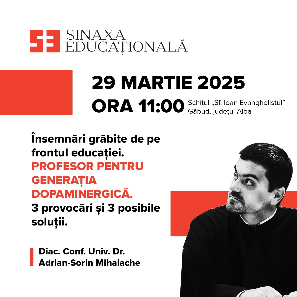 Sinaxa educațională, o comunitate a profesorilor care integrează valorile religioase creștin-ortodoxe în educație, vă invită, în perioada 28-30 martie 2025, la Schitul „Sfântul Ioan Evanghelistul” de la Găbud, jud. Alba, la întâlnirea de primăvară, cu tema „Generația dopaminergică”.