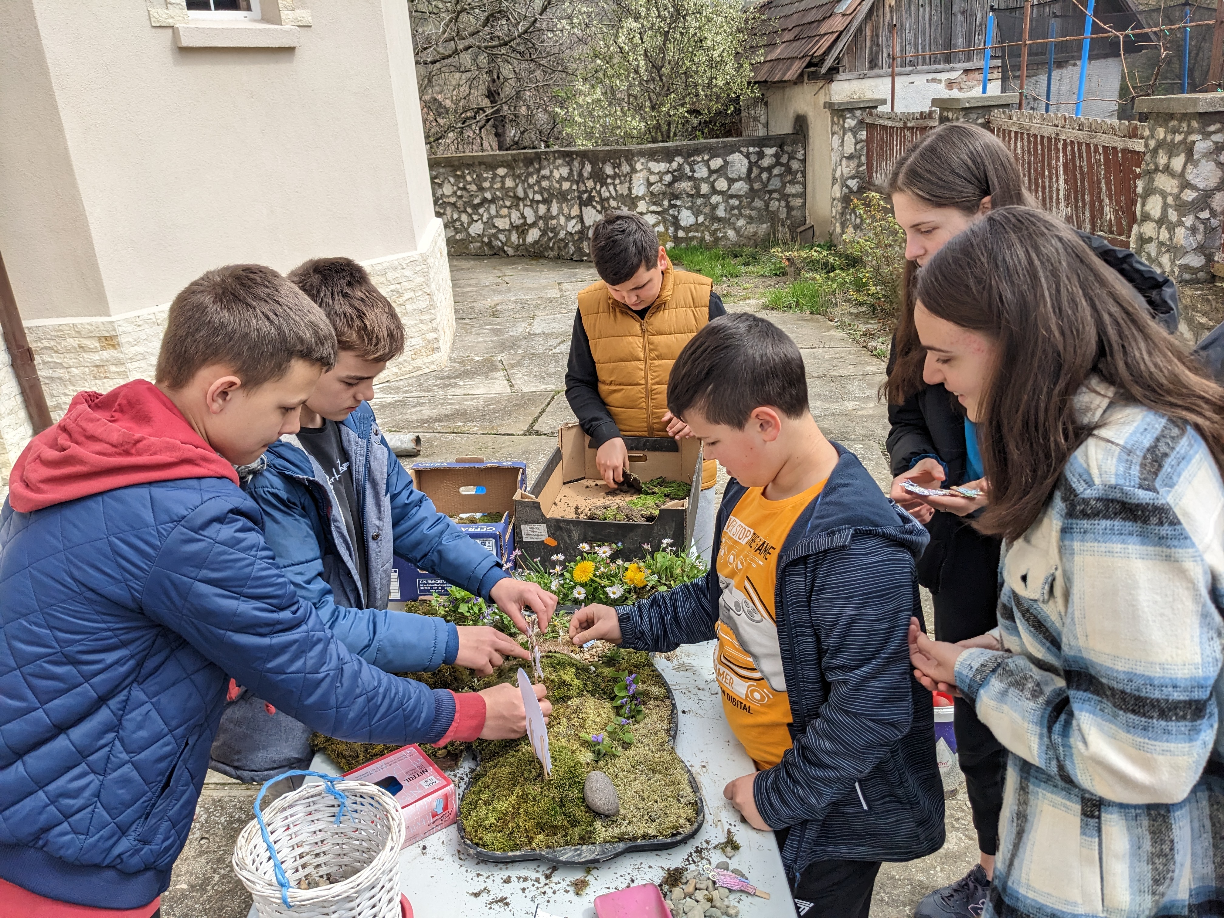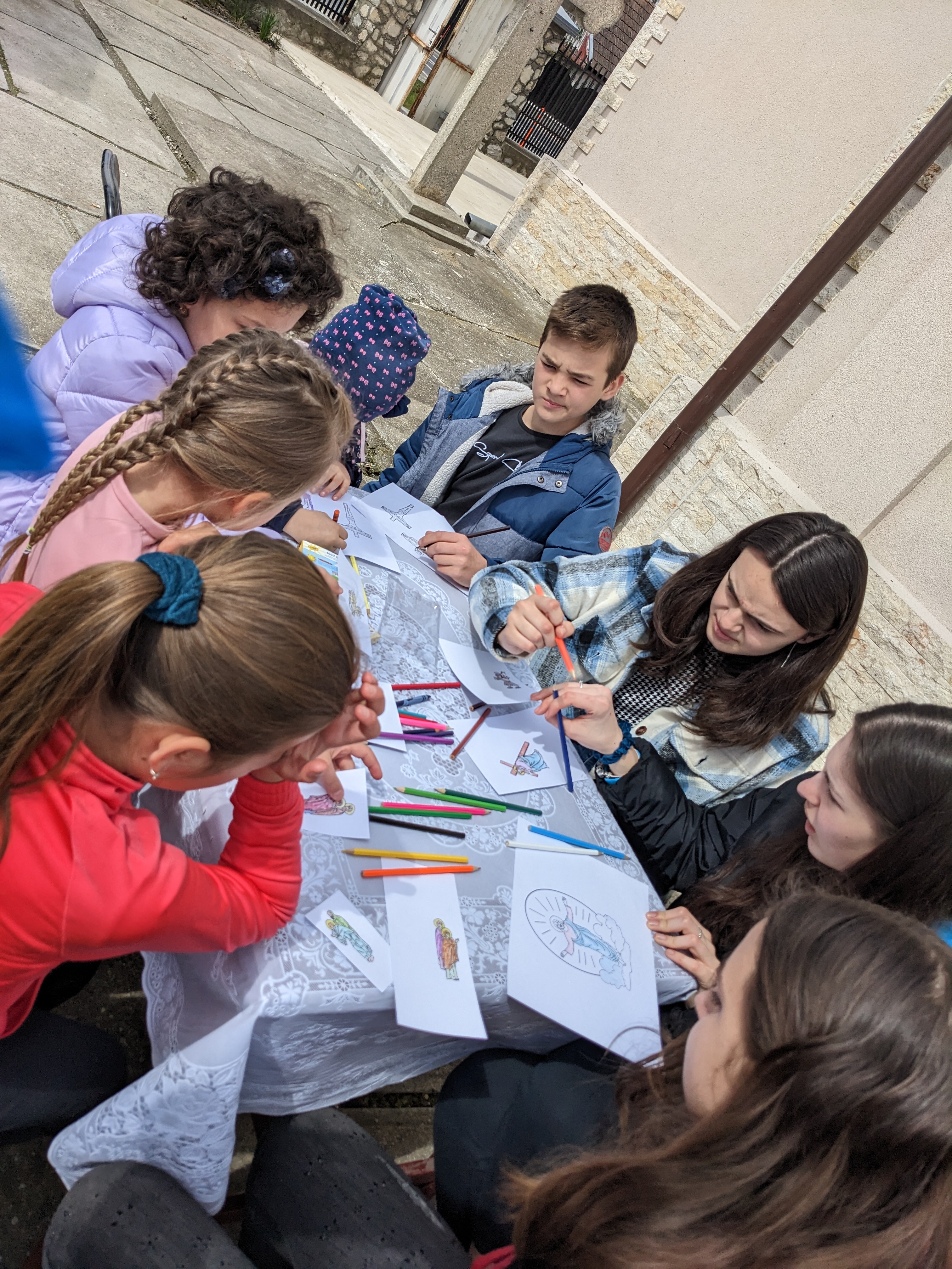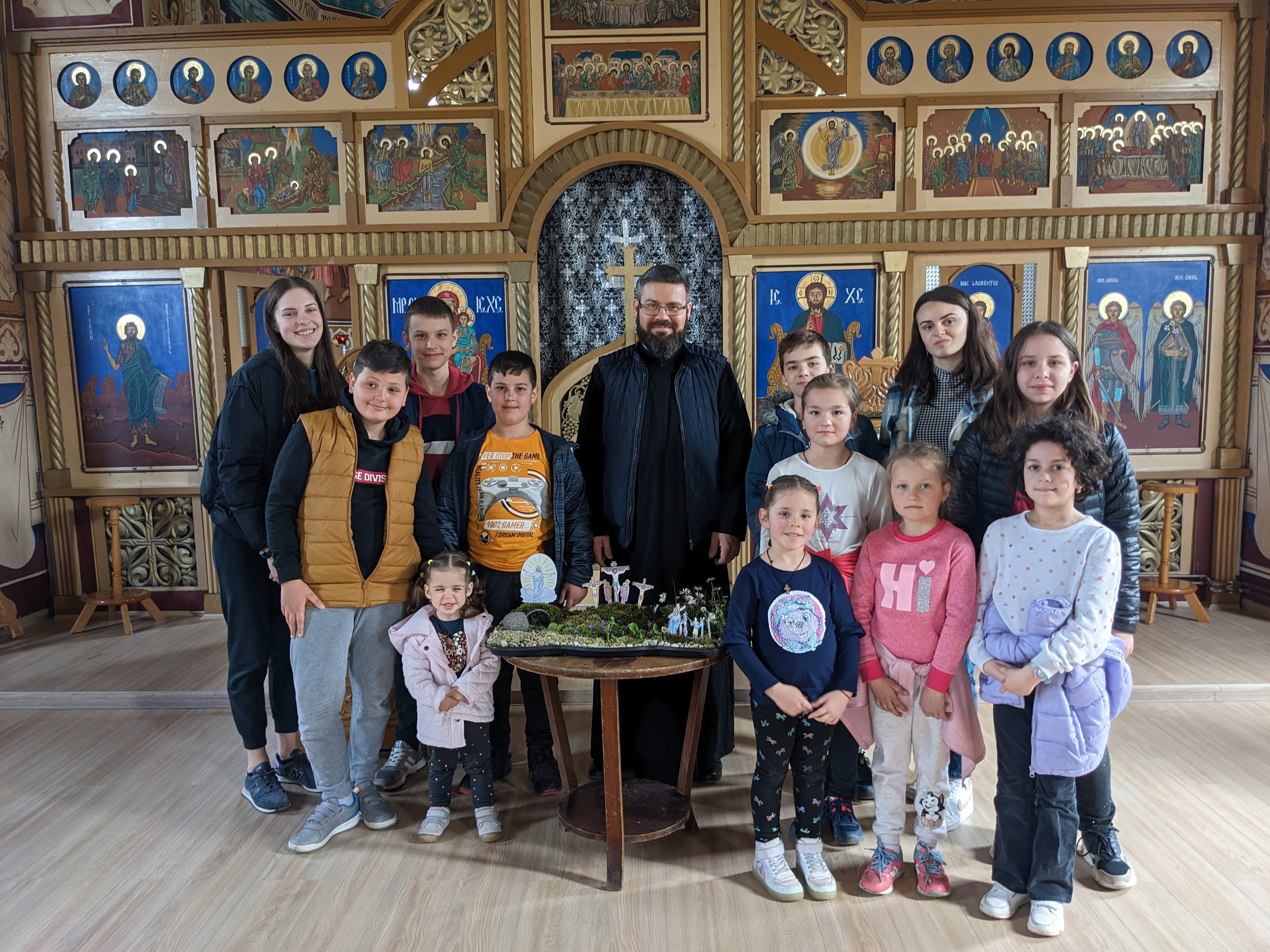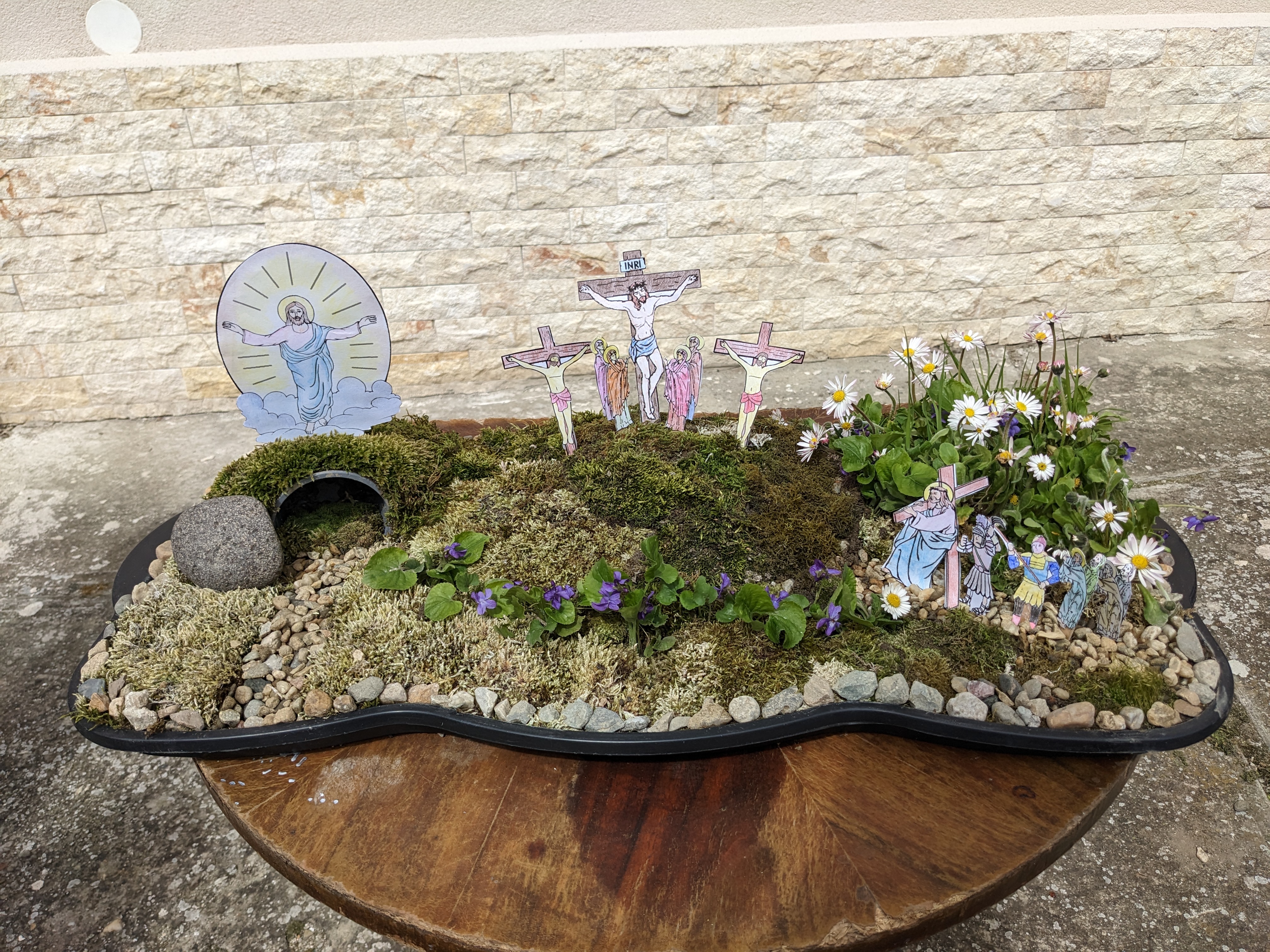 Învățămintele primite au continuat cu o parte practică, totul concretizându-se în construirea unei machete realiste care înfățișează parcursul Mântuitorului din următoarele zile. Copiii au adunat materialele necesare din curtea bisericii și împrejurimi, au realizat mini-personaje colorate pe carton, iar apoi au construit macheta ce va fi expusă în biserică pe toată perioada Sfintelor Paști. Prima scenă realizată a fost Drumul Crucii, pășind pe urmele Mântuitorului spre dragostea nemăsurată a lui Dumnezeu față de oameni. Pentru întocmirea acesteia, copiii au pavat drumul cu pietricele, au construit personajele și au împodobit împrejurimile cu flori culese chiar de către ei. Apoi, Dealul Golgotei a fost realizat din pământ căptușit cu mușchi. Deasupra, au fost așezate cele trei cruci, respectiv cea a Mântuitorului și ale celor doi tâlhari, fiind evidențiate și mironosițele care-L plângeau pe Iisus. Ultima scenă construită a fost cea a Învierii Domnului. Aceasta a fost realizată prin expunerea Sfântului Mormânt și a pietrei răsturnate, deasupra căruia stă Iisus cel Înviat.