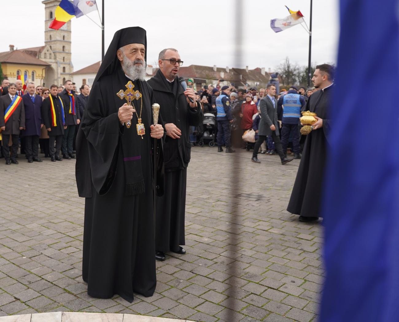 În continuare, de la ora 12.00, Întâistătătorul Eparhiei noastre, Părintele Arhiepiscop Irineu, a participat la ceremonia de arborare a drapelului național al României, amplasat pe catargul din Piața Tricolorului. Cu acest prilej, Arhipăstorul nostru a binecuvântat drapelul național, în prezența oficialităților județene și locale, a reprezentanților Ministerului Afacerilor Interne (MAI) și ai Ministerului Apărării Naționale (MApN), precum și a numeroși clerici și credincioși din Cetatea gloriei lui Mihai Viteazul. Ceremonia binecuvântării drapelului, săvârșită anual în data de 30 noiembrie, se înscrie în seria evenimentelor solemne programate la Alba Iulia în contextul Zilei Naționale a României.