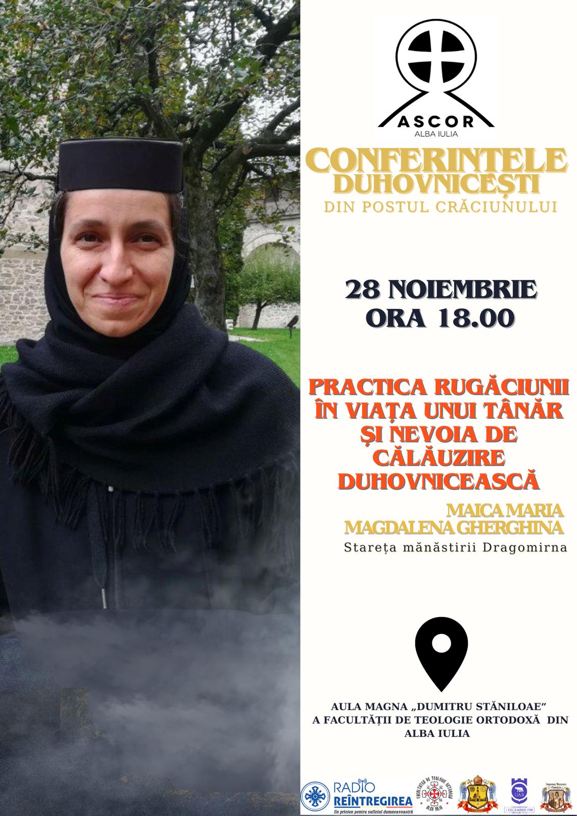 Preacuvioșia sa va susține conferința intitulată „Practica rugăciunii în viața unui tânăr și nevoia de călăuzire duhovnicească”. Întâlnirea se va desfășura în Aula Mare „Dumitru Stăniloae” din incinta Facultății de Teologie Ortodoxă din vechea Cetate a Bălgradului. Intrarea la eveniment va fi liberă, în limita locurilor disponibile, conferința fiind transmisă în direct pe pagina oficială de Facebook ASCOR Alba Iulia. În paralel cu nevoința specifică viețuirii monahale, Stavrofora Maria Magdalena Gherghina a manifestat pe parcursul timpului o preocupare intensă pentru studiu, cercetând cu minuțiozitate arhiva Mănăstirii Dragomirna.