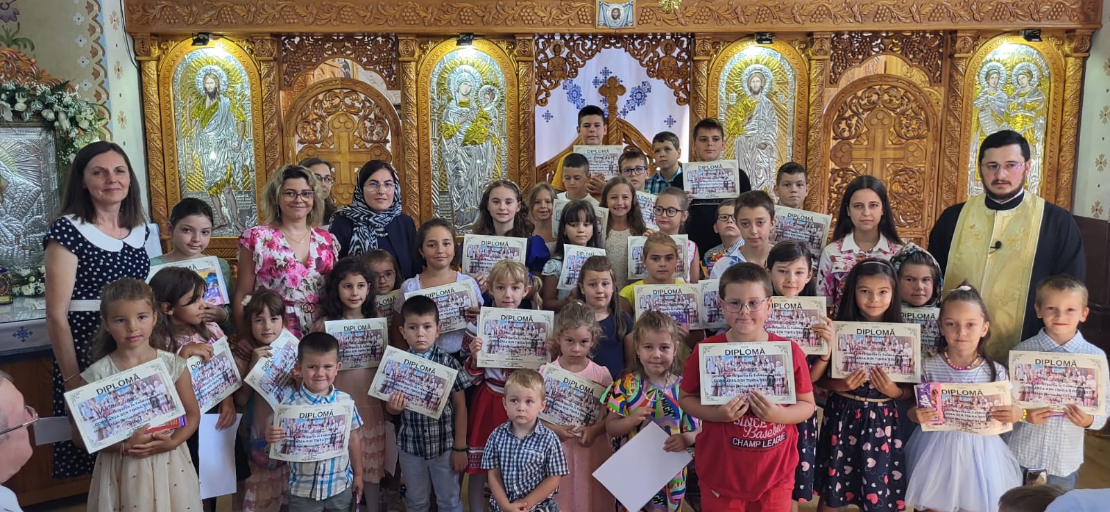 Încununarea taberei a avut loc duminică, 13 august 2023, la Sfânta Liturghie, unde toți cei mici s-au împărtășit cu Sfintele Taine și au primit din partea parohiei câte o diplomă și mai multe daruri.