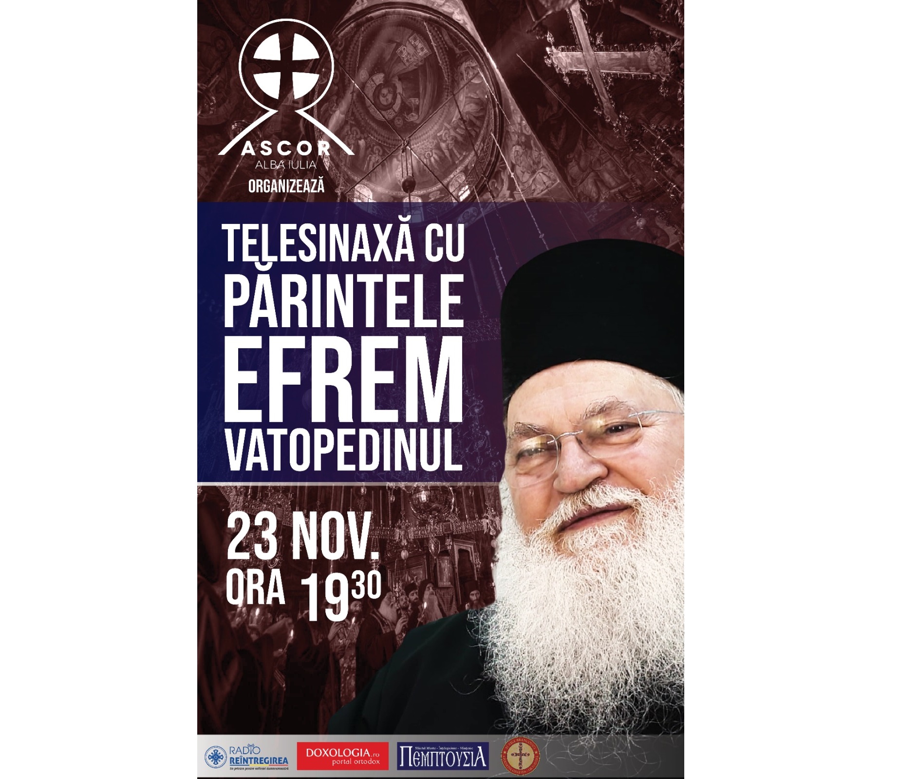 Luni, 23 noiembrie 2020, începând cu ora 19:30, Părintele Arhimandrit Efrem Vatopedinul, Starețul Mănăstirii Vatoped din Sfântul Munte Athos, va participa la telesinaxa organizată de Asociația Studenților Creștini Ortodocși Români – filiala Alba Iulia, Pemptousia, Doxologia, Radio Reîntregirea și Asociația „Sfântul Ierarh Sava Brancovici”. În cadrul întâlnirii online va fi prezent Înaltpreasfințitul Părinte Arhiepiscop Irineu, care va adresa în deschiderea sesiunii un cuvânt de binecuvântare. Evenimentul se va derula pe platforma Zoom și va fi transmis live pe paginile oficiale de facebook ale Arhiepiscopiei Alba Iuliei, ASCOR Alba Iulia, Radio Reîntregirea și pe pagina de Youtube.