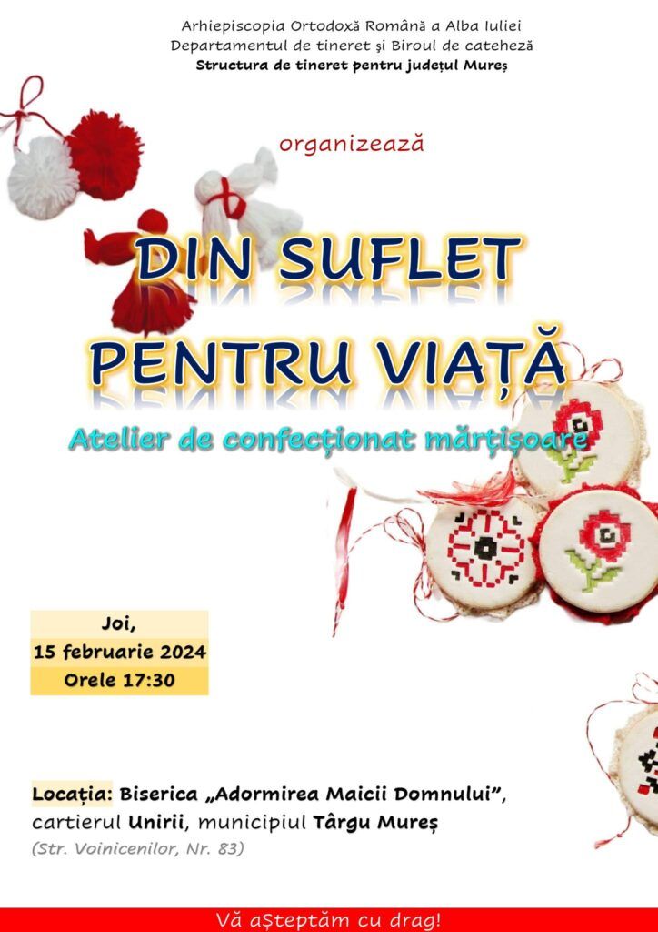 Arhiepiscopia Alba Iuliei, prin Departamentul de tineret și Biroul de cateheză – Structura de tineret pentru județul Mureș, invită mureșenii la un Atelier de confecționat mărțișoare, intitulat „Din suflet pentru viață”. Evenimentul va avea loc joi, 15 februarie 2024, de la ora 17.30, la biserica „Adormirea Maicii Domnului” din Târgu Mureș (cartierul Unirii). Manifestarea se înscrie în seria activităților dedicate Lunii pentru viață. Prin participarea la Atelier, tinerii își vor manifesta prețuirea pentru viață și pentru cele mai importante femei din viața noastră: mama, bunica, sora, prietena, vecina sau cadrele didactice.