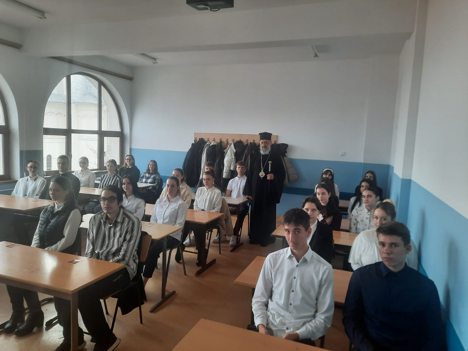 Vineri, 4 noiembrie 2022, de la ora 10.00, Înaltpreasfinţitul Părinte Arhiepiscop Irineu a efectuat o vizită pastorală la Seminarul Teologic Ortodox „Sfântul Simion Ştefan” din Alba Iulia. Chiriarhul nostru, însoțit de către părintele profesor Eugen Pintea, directorul unității de învățământ, s-a întâlnit cu elevii clasei a XII-a B, din cadrul secției Filologie (diriginte: prof. Felicia Todoran). Cu acest prilej, Întâistătătorul Eparhiei noastre le-a adresat tinerilor teologi cuvinte folositoare de suflet, îndemnându-i să ducă o viață curată și bineplăcută lui Dumnezeu.