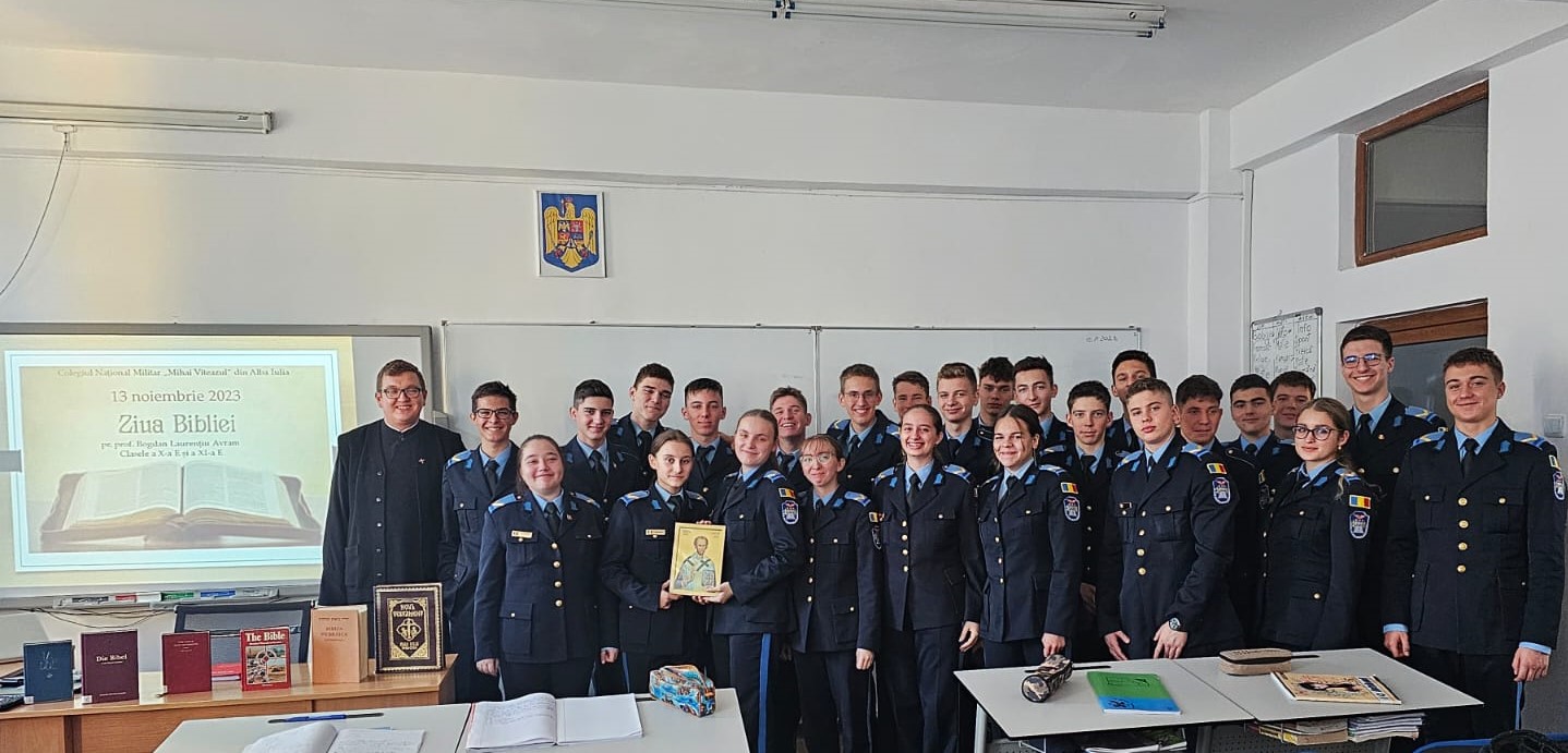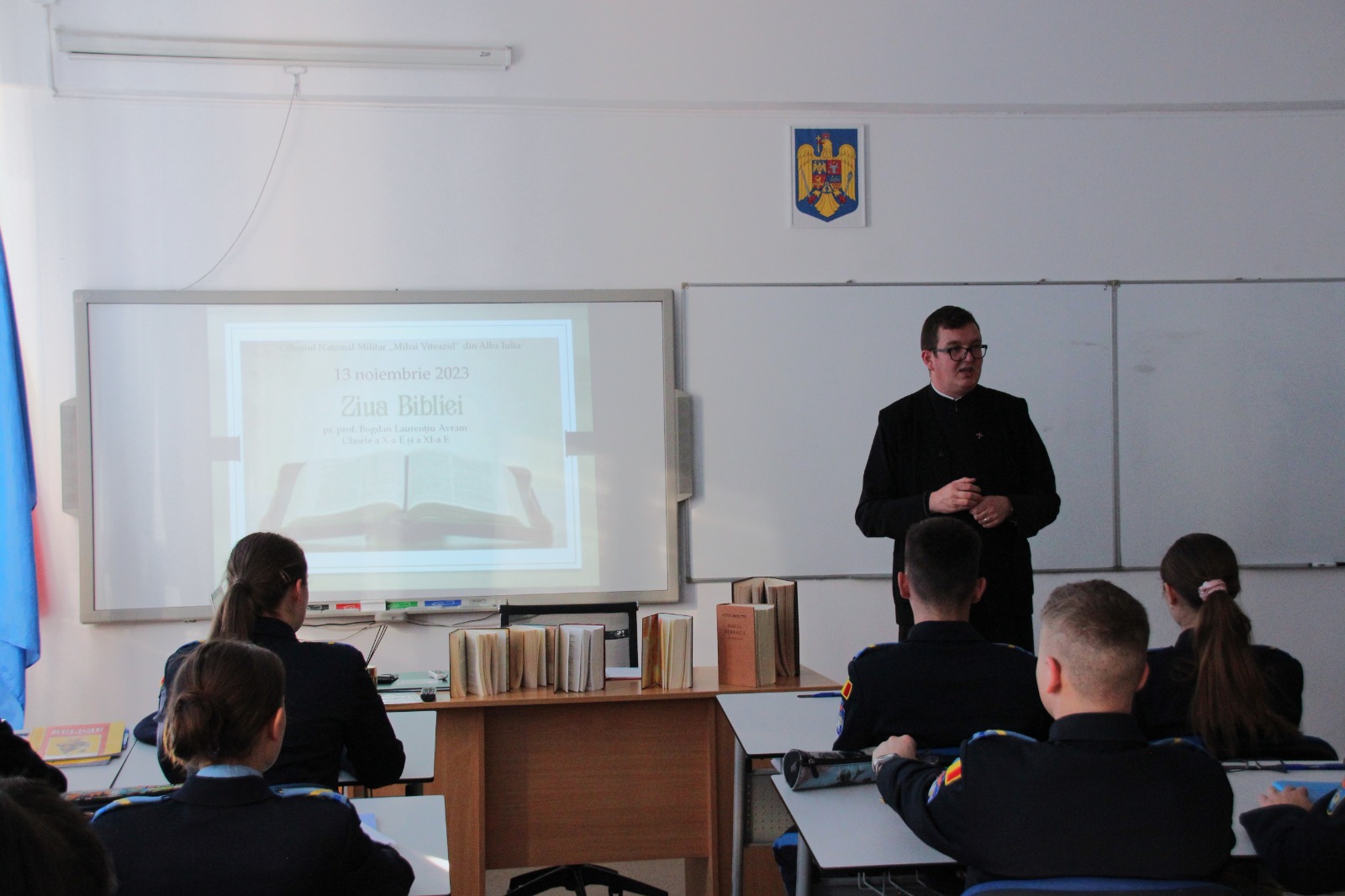 Luni, 13 noiembrie, la Colegiul Național Militar ,,Mihai Viteazul" din Alba Iulia, s-a desfășurat un eveniment deosebit, prilejuit de Ziua Mondială a Bibliei (13 noiembrie). Această primă ediție, intitulată „Cuvântul lui Dumnezeu în viața tinerilor”, a fost realizată la inițiativa subsemnatului și a elevilor claselor a X-a E și a XI-a E. La eveniment a participat părintele capelan Constantin Bratu și preotul militar Ion Roncea, reprezentantul asistenței religioase din SMFA. Ziua Bibliei a fost instituită în România la propunerea și prin hotărârea Sfântului Sinod al Bisericii Ortodoxe Române, în zilele de 14-15 noiembrie 2006.