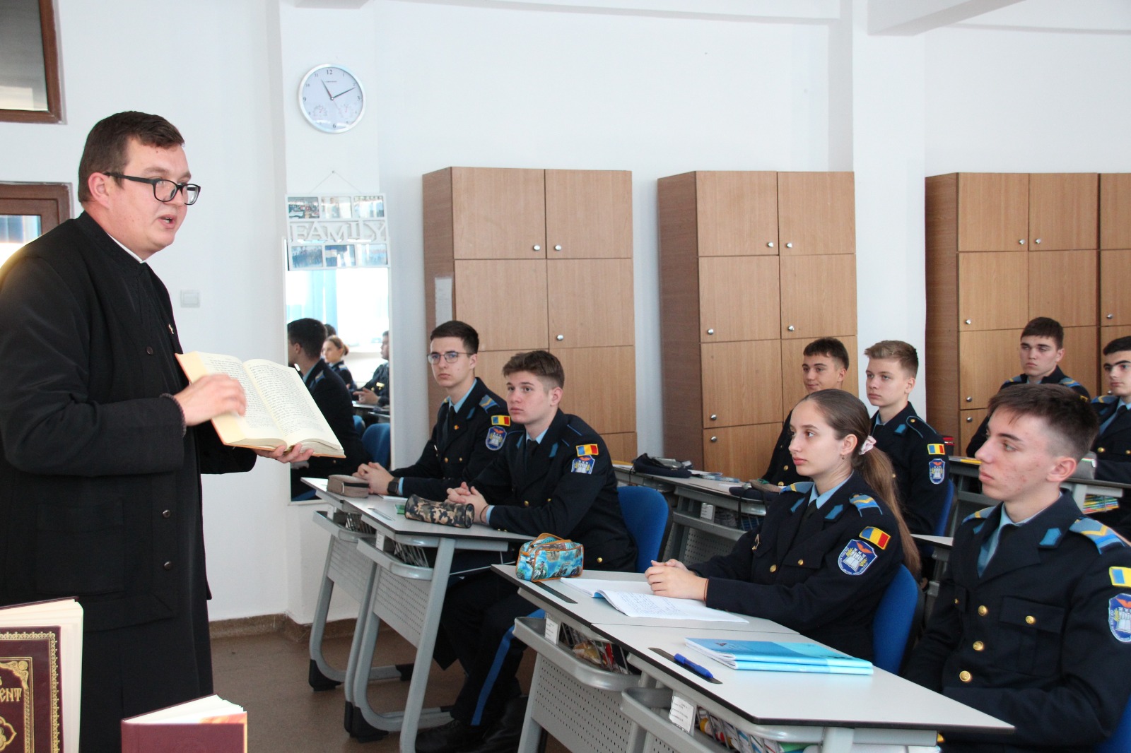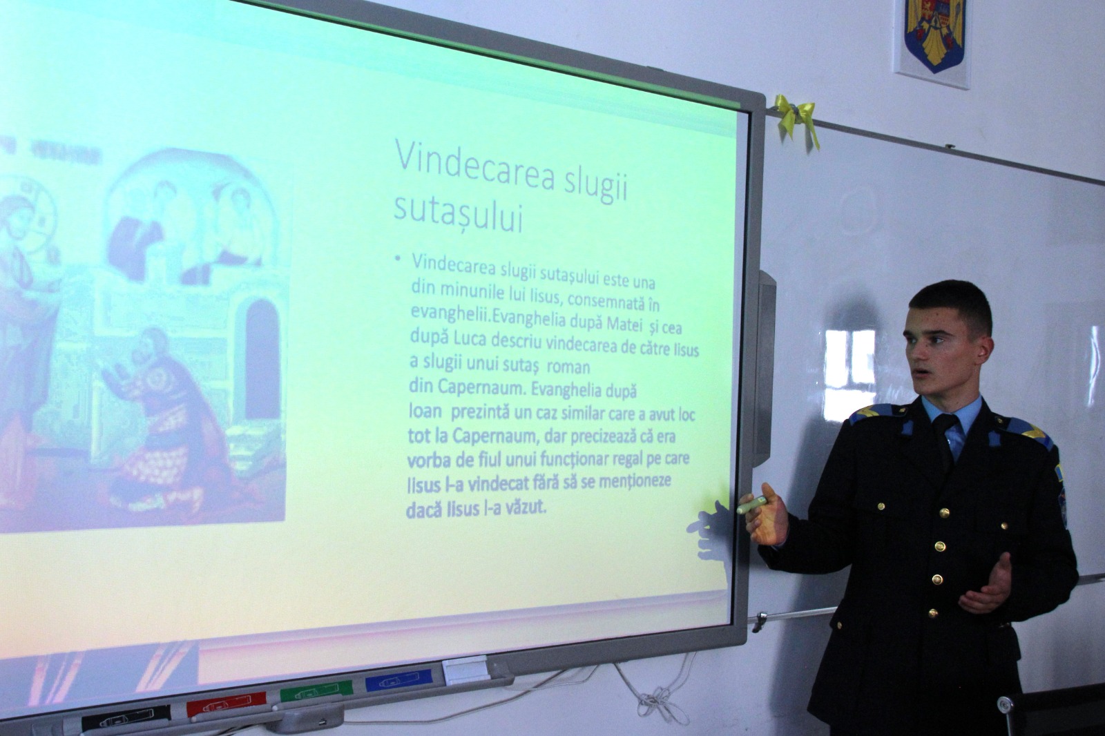 Apoi, în continuarea lecției, elevii clasei a X-a au prezentat cele zece porunci, aducând câte o explicație pe înțelesul colegilor, iar elevii din clasa a XI-a au prezentat minunile și vindecările pe care Domnul Hristos le-a făcut în activitatea Sa. Elevii au citit apoi pasaje din Scriptură în limba engleză, franceză și greacă. Scopul acestei activități a fost acela de a sădi „sămânța” cuvântului Sfintei Scripturi în inimile curate ale tinerilor participanți care cu siguranță va da rod la vremea potrivită. La final, fiecare clasă a primit câte o icoană cu Sfântul Ioan Gură de Aur, cel care arată că „Sfânta Scriptură este de la Dumnezeu” și o numește „adevăr capital, dogmă esențială și fundamentală pe care n-ar trebui s-o uite niciodată savanții, interpreții și lingviștii”.