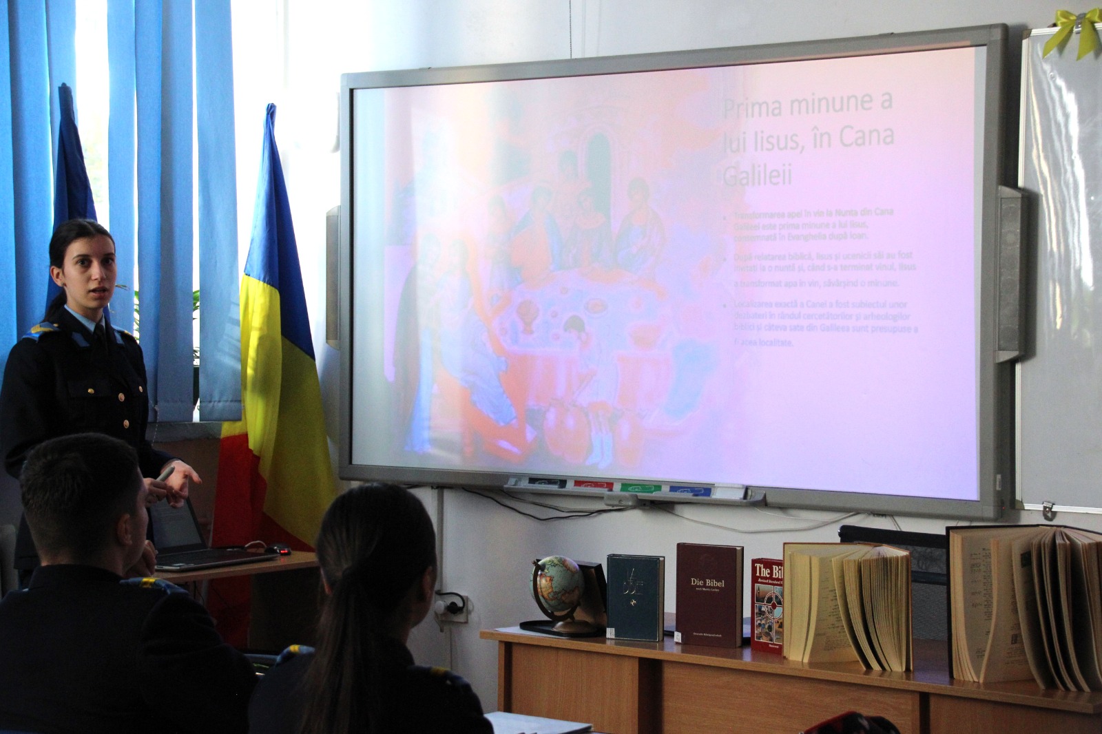 În deschiderea evenimentului, le-am vorbit elevilor despre Sfânta Scriptură, ca singura carte al cărei Autor este prezent când o citești. De asemenea, le-am prezentat mai multe exemplare de Biblii scrise în diferite limbi (ebraică, greacă, engleză, franceză și germană) și le-am vorbit despre prima ediție tipărită a Noului Testament în limba română, care a văzut lumina tiparului la Bălgrad (Alba Iulia) în anul 1648. Totodată, le-am prezentat biografia Sfântului Ioan Gură de Aur pomenit de Biserică în această zi.